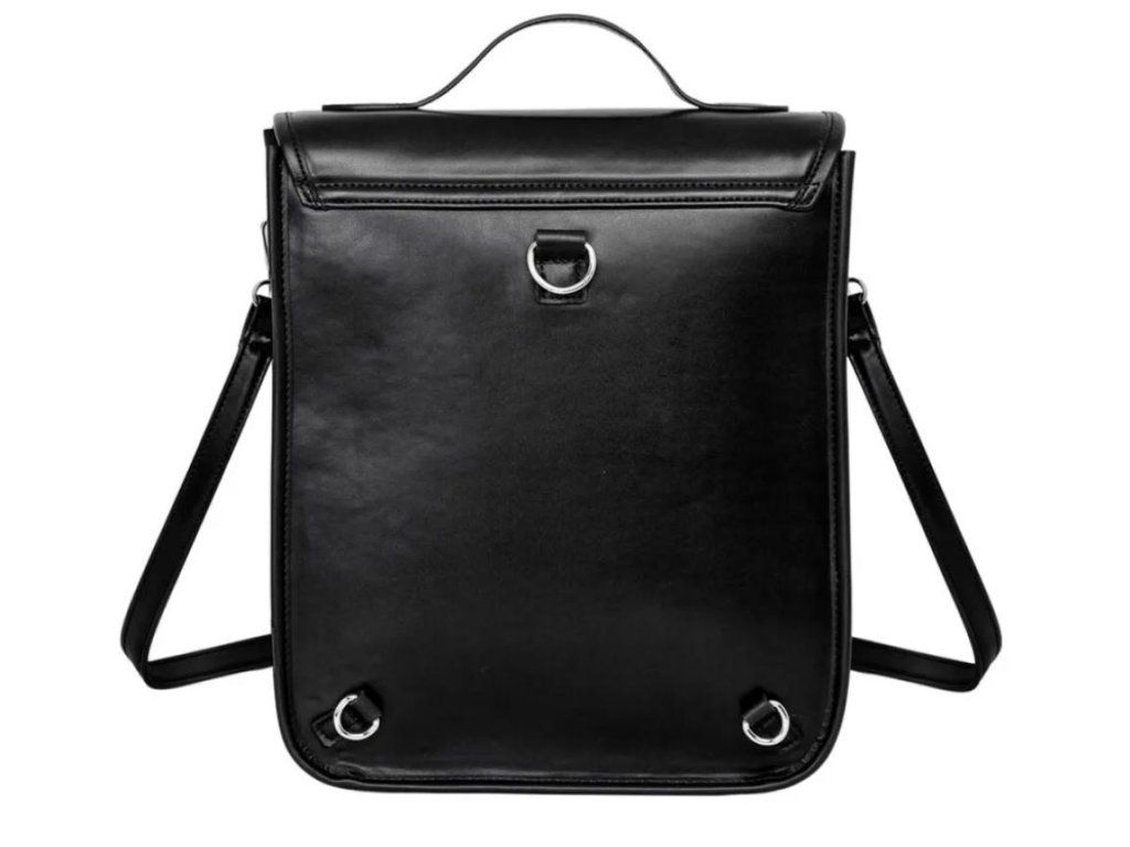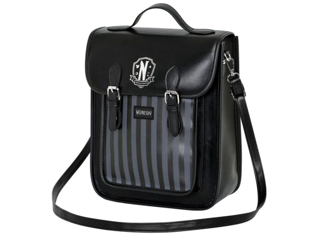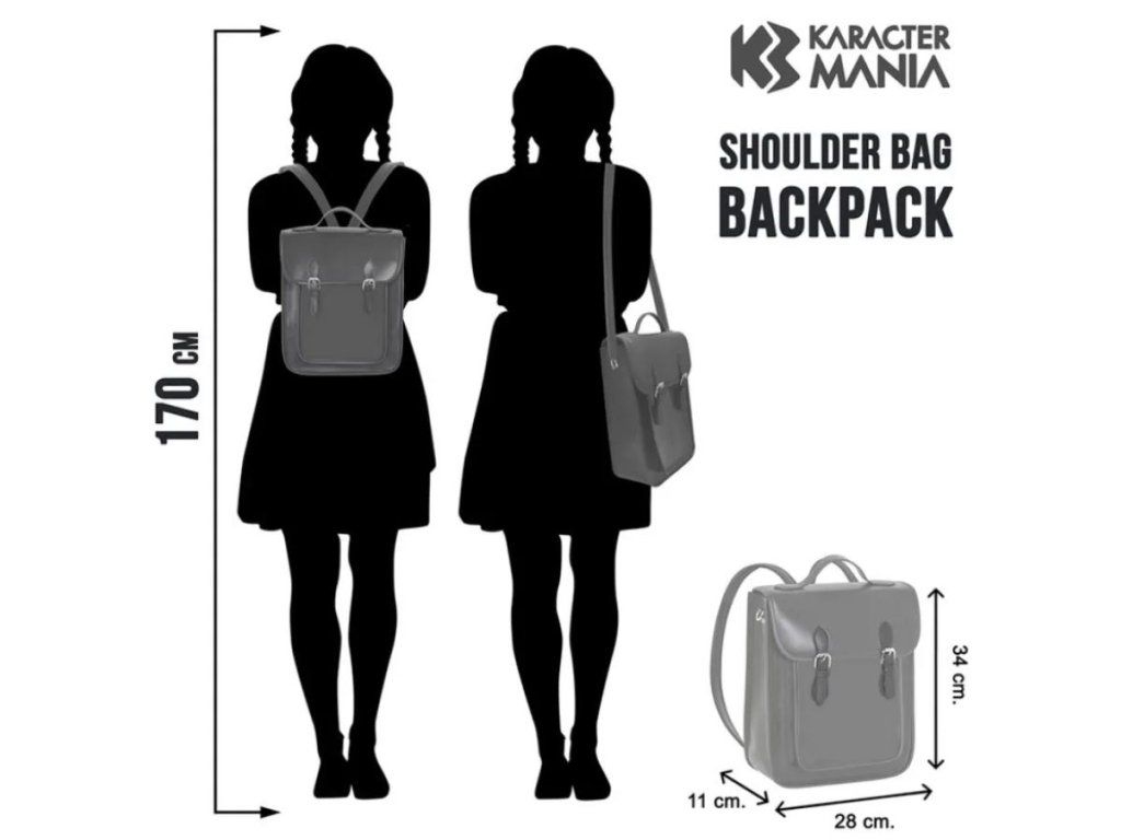Stylový černý multifunkční batoh vyvedený s grafikou Akdaemie Nikdyvíc ze seriálu Wednesday od společnosti Netflix. Batoh má jednu velkou kapsu, ve které se nachází vnitřní designová kapsa na notebook, jednu menší kapsu na drobnosti a cennosti, nastavitelné popruhy a ucho pro nošení v ruce. Popruh batohu lze sundat a připnout pouze se stran tašky, tak aby vznikla kabelka. Rázem se z batohu stává taška 3 v 1 (taška, kabelka a batoh).