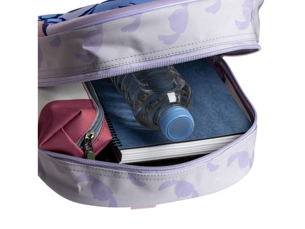 Stylový batůžek s boční kapsou v motivu oblíbené postavičky Stitch. Má plně podšitý a personalizovaný vnitřek, polstrovaná záda a ergonomické, nastavitelné a měkce polstrované ramenní popruhy. Kvalitní zpracování a odolné zipy zajišťují dlouhou životnost. Vyrobeno z prodyšného a odolného polyesterového materiálu vhodného pro každodenní nošení.