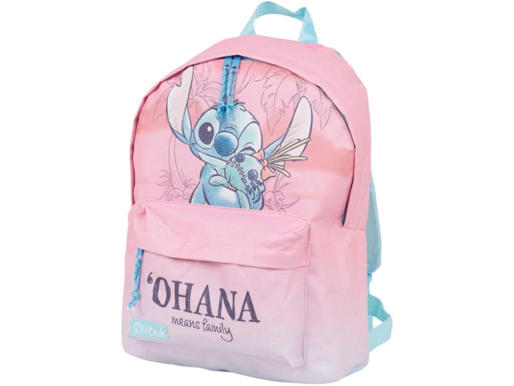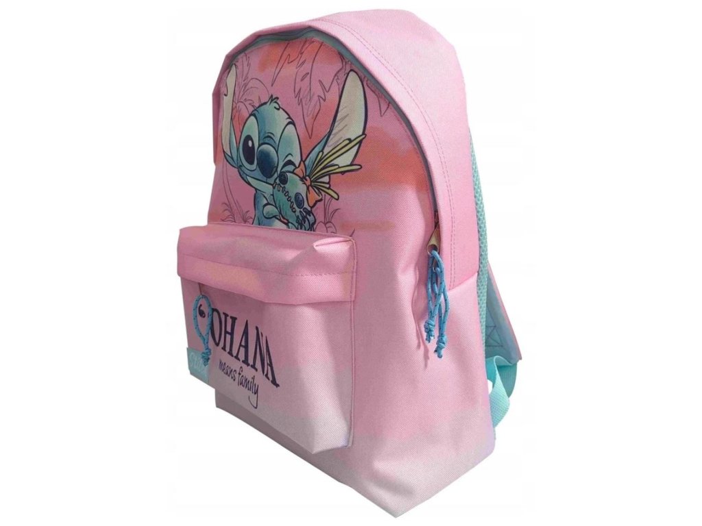 Atraktivní růžový batoh s nápisem Ohana means family a grafikou Stitche z pohádky Lilo and Stitch. Batoh je vyroben z vysoce kvalitního polyesterového materiálu. Batoh disponuje menší přední kapsou a velkým hlavním prostorem s uzavíraním na zip. Polstrované záda s délkově nastavitelnými popruhy dodávají batohu na pohodlnosti při nošení na zádech. Obsahuje i ucho vhodné pro snadné přenášení v ruce. Batoh bude výborný pomocník na přenášení materiálu jak do školy, školky, tak do kroužků či na výlety pro každého milovníka roztomilého mimozemšťana Stitche.