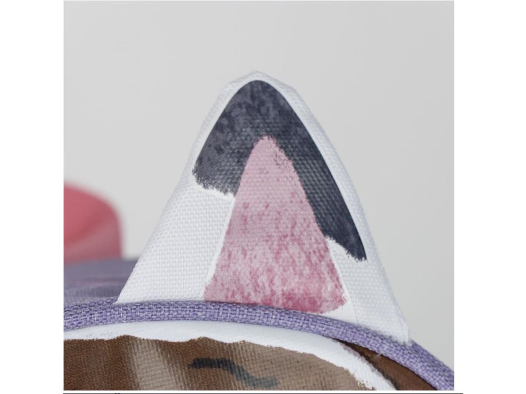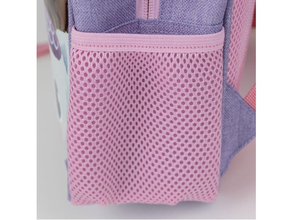 Dětský fialový batoh s 3D ušima inspirovaný holčičkou Gábi a kočkou z kouzelného domečku. Batoh má jednu velkou kapsu. Batoh má boční kapsu na láhev a polstrovaná záda. Batoh je opatřen uchem na nošení v ruce a dvěma nastavitelnými popruhy na záda.