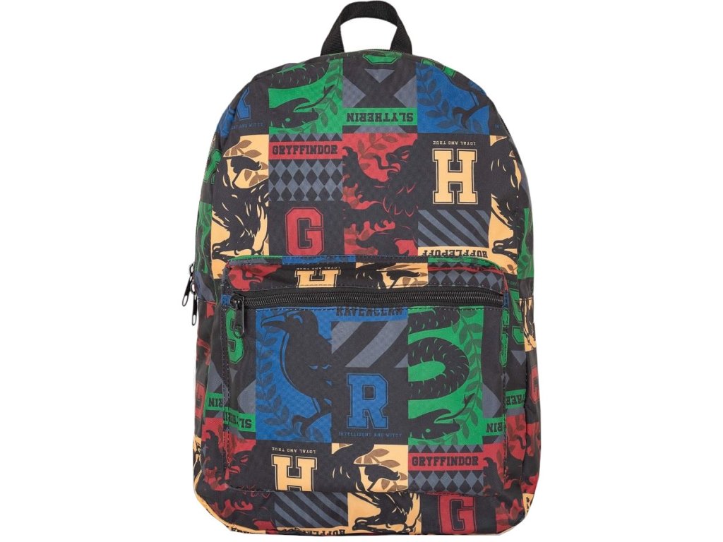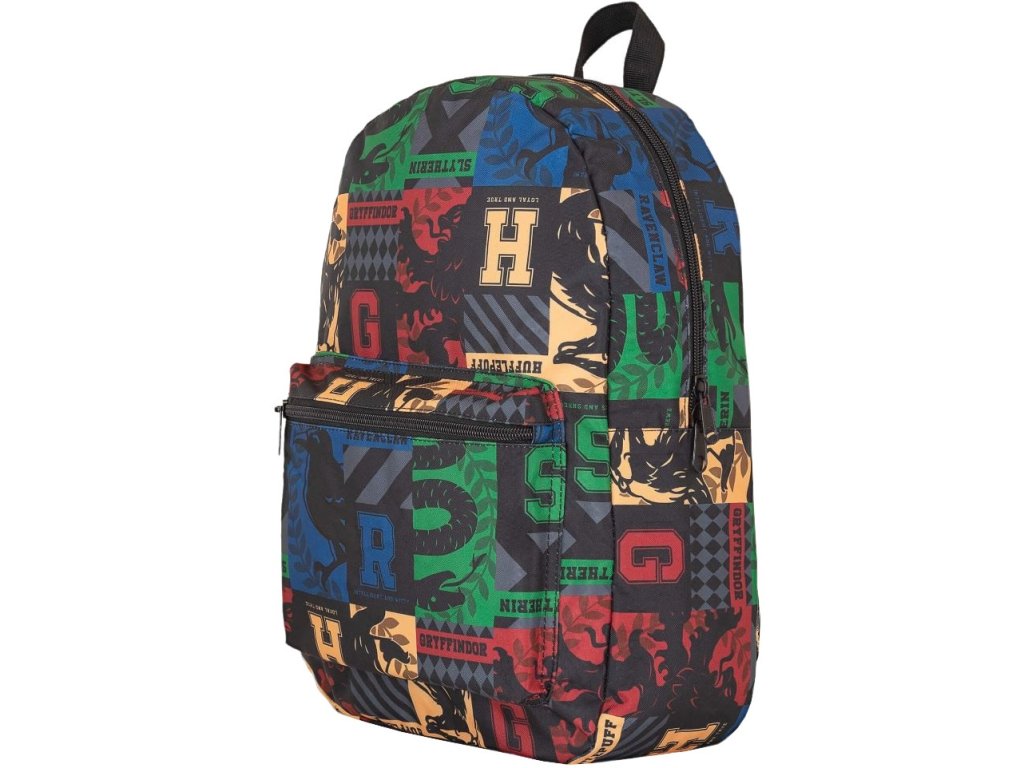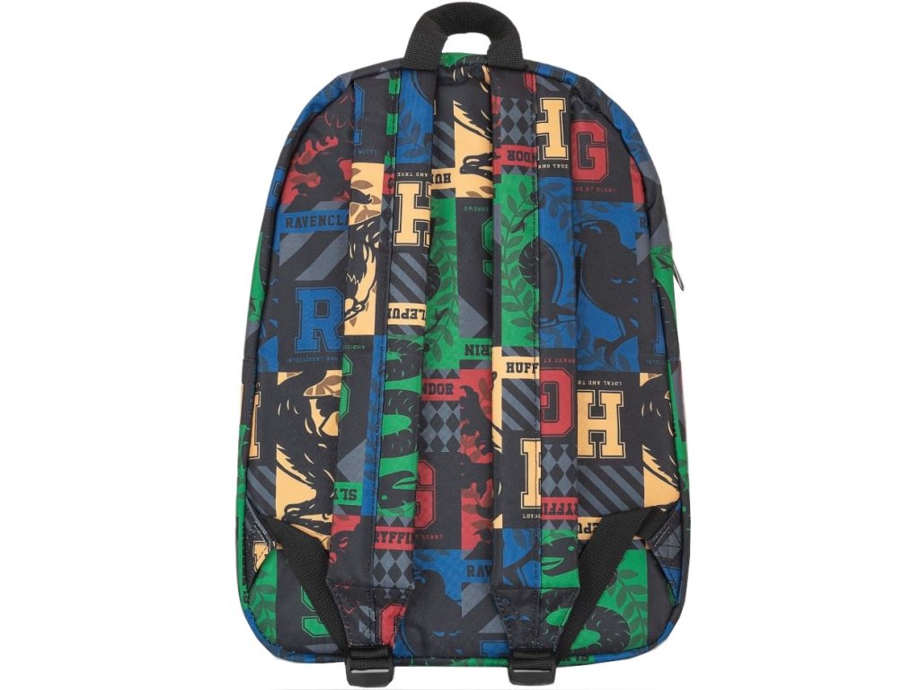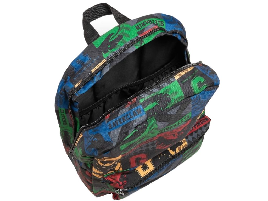 Atraktivní černý školní batoh s menší přední kapsou, vyobrazeným barevným motivem všech 4 školních kolejí (school dorms) a grafikou Harryho Pottera. Batoh má délkově nastavitelné popruhy a ucho pro snadné nošení v ruce, proto je vhodný pro všechny menší i větší fanoušky kouzelnické ságy Harryho Pottera.