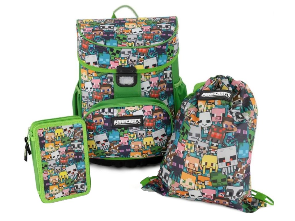 Tento stylový školní set s motivem oblíbené hry Minecraft je ideální volbou pro malé školáky a fanoušky této ikonické hry. Set obsahuje ergonomický školní batoh s prostornou hlavní přihrádkou, přední kapsou na zip a bočními kapsami, který díky pevnému dnu a polstrovaným ramenním popruhům zajišťuje maximální pohodlí při nošení. Součástí je také praktický vak se stahovací šňůrkou, vhodný na přezůvky nebo tělocvik a dvoupatrový penál, který nabízí dostatek prostoru pro všechny psací potřeby.