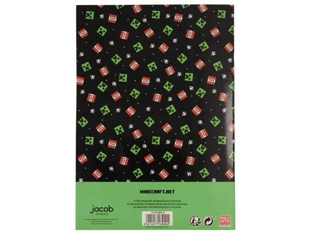 Čtverečkovaný sešit s měkkou lesklou vazbou s ofsetovým papírem. Na vnitřní straně krytu jsou v designu zelené hlavy postavy Creeper. Na zadní straně bloku jsou ikony TNT a Creepera. Blok má 48 listů/96 stran)