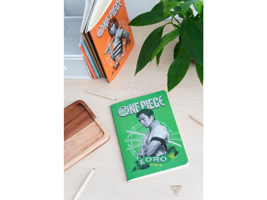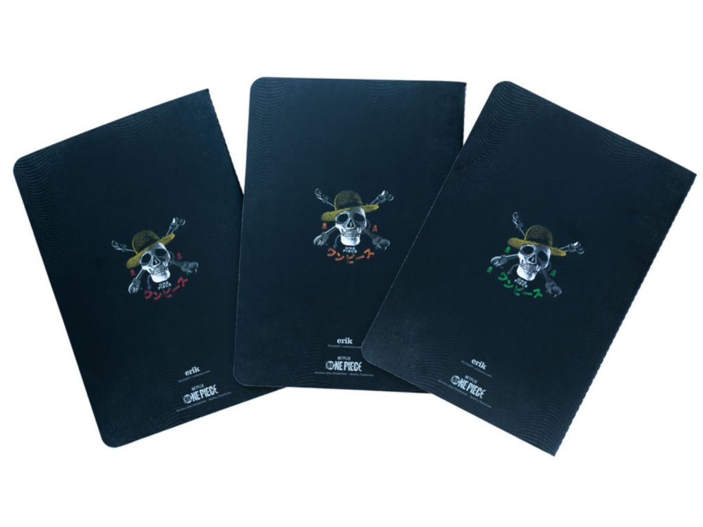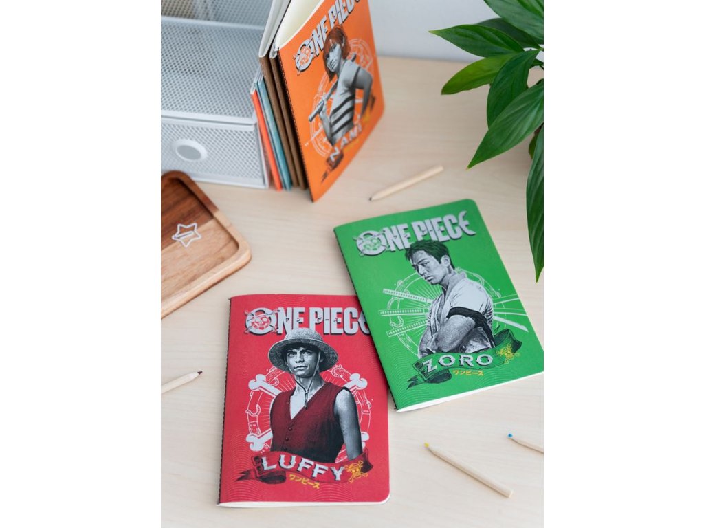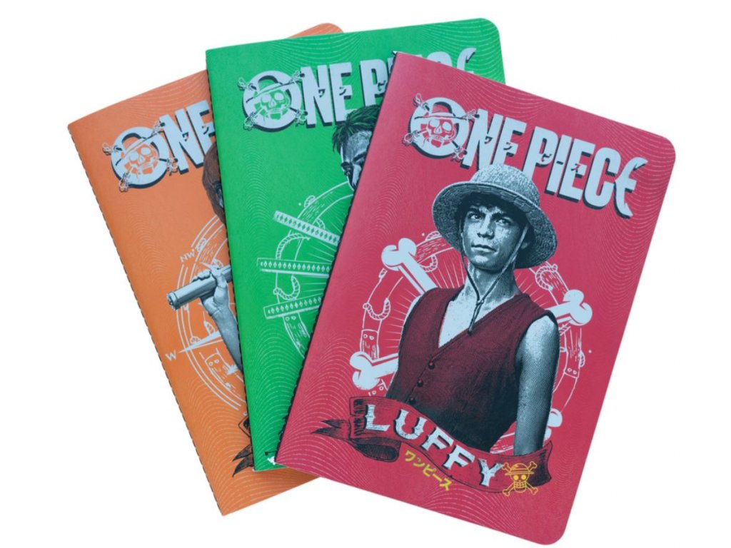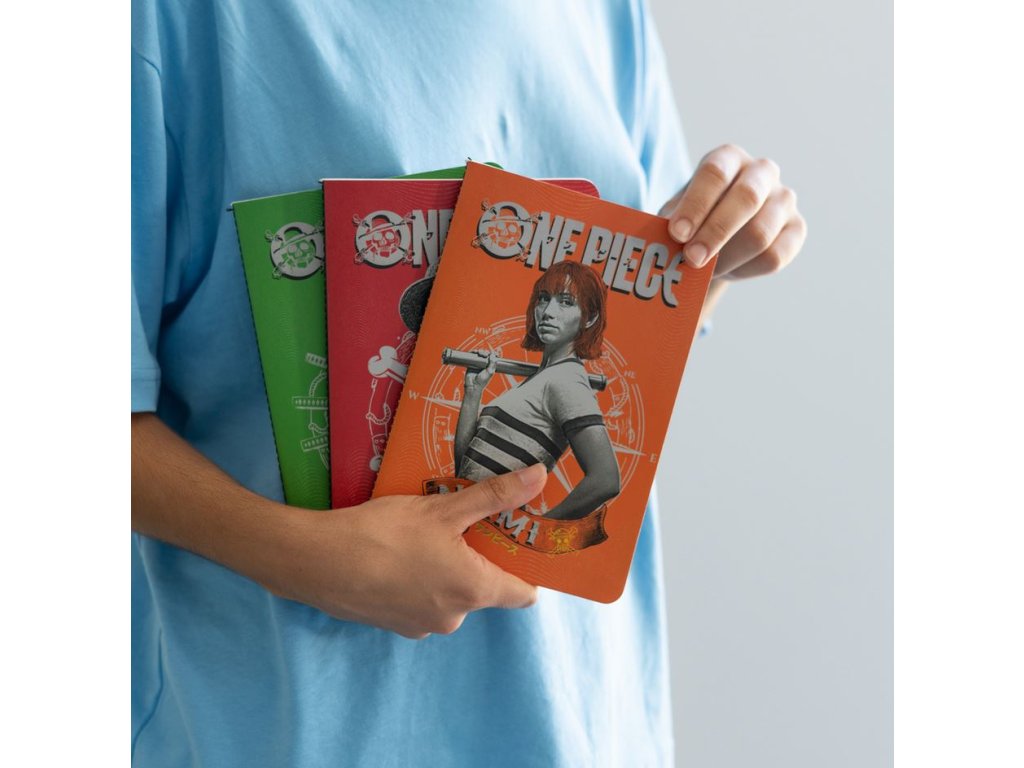 Set tří A5 zápisníků s barevným designem z jedné z nejznámějších a nejzábavnějších anime sérií, bájného One Piece s hlavními postavami Luffy, Zoro a Nami. Každý blok má pevnou vazbu a uvnitř má lemované papíry s anime motivy. Dalším plusem zápisníků je to, že každý zápisník má jiné stránky (jeden je linkovaný, jeden je nelinkovaný a jeden je čtverečkovaný), takže je můžete střídat dle potřeby.