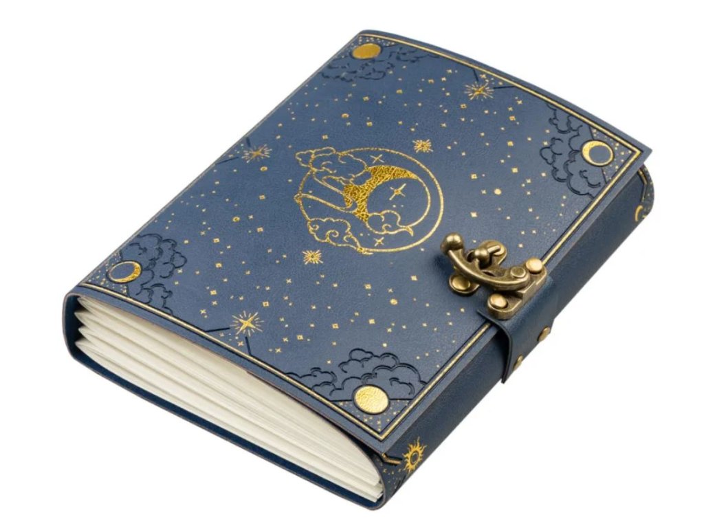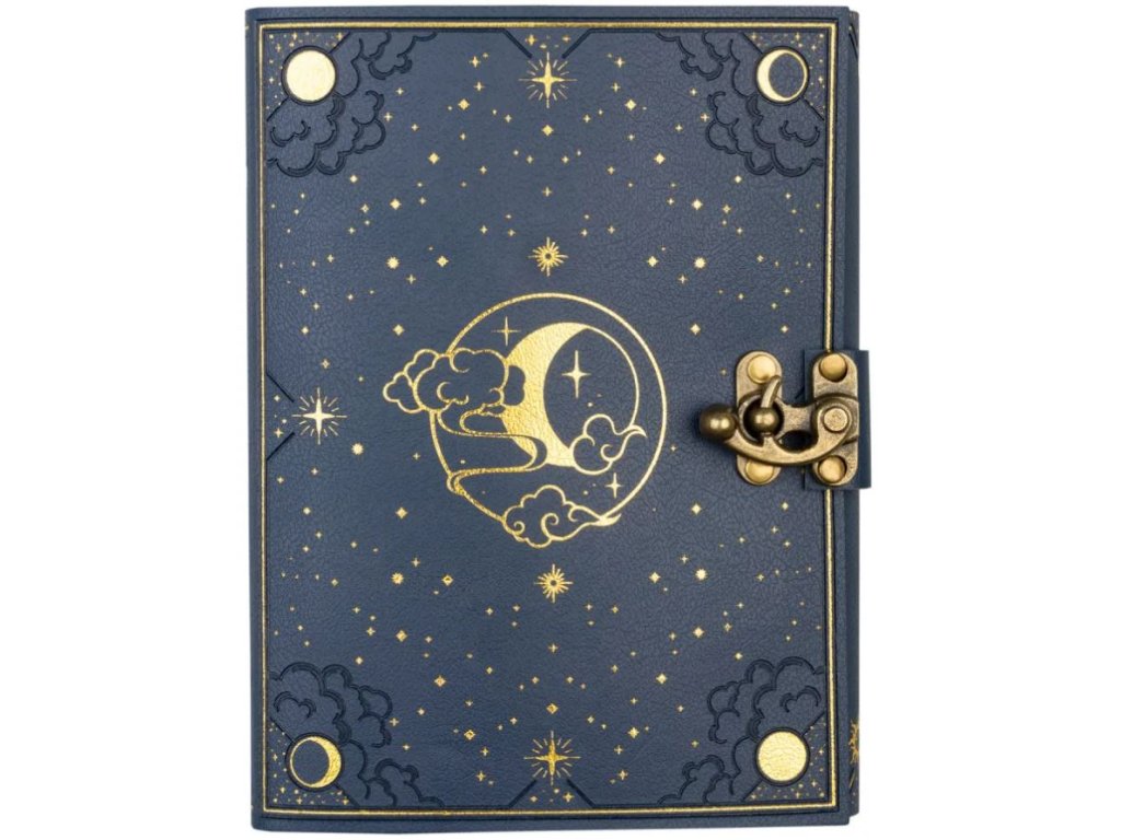 Poznámkový blok s motivem hvězdné oblohy. Blok s měkkou vazbou z materiálu PU o rozměrech 22,5 x 17 x 2,6 cm s prolisováním a personalizovaným potiskem, šitou vazbou a předním kovovým zapínáním. Poznámkový blok je ručně šitý a obsahuje 90 listů (180 stran) nelinkovaného recyklovaného bezkyselinového krémového papíru.