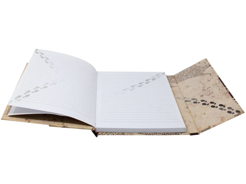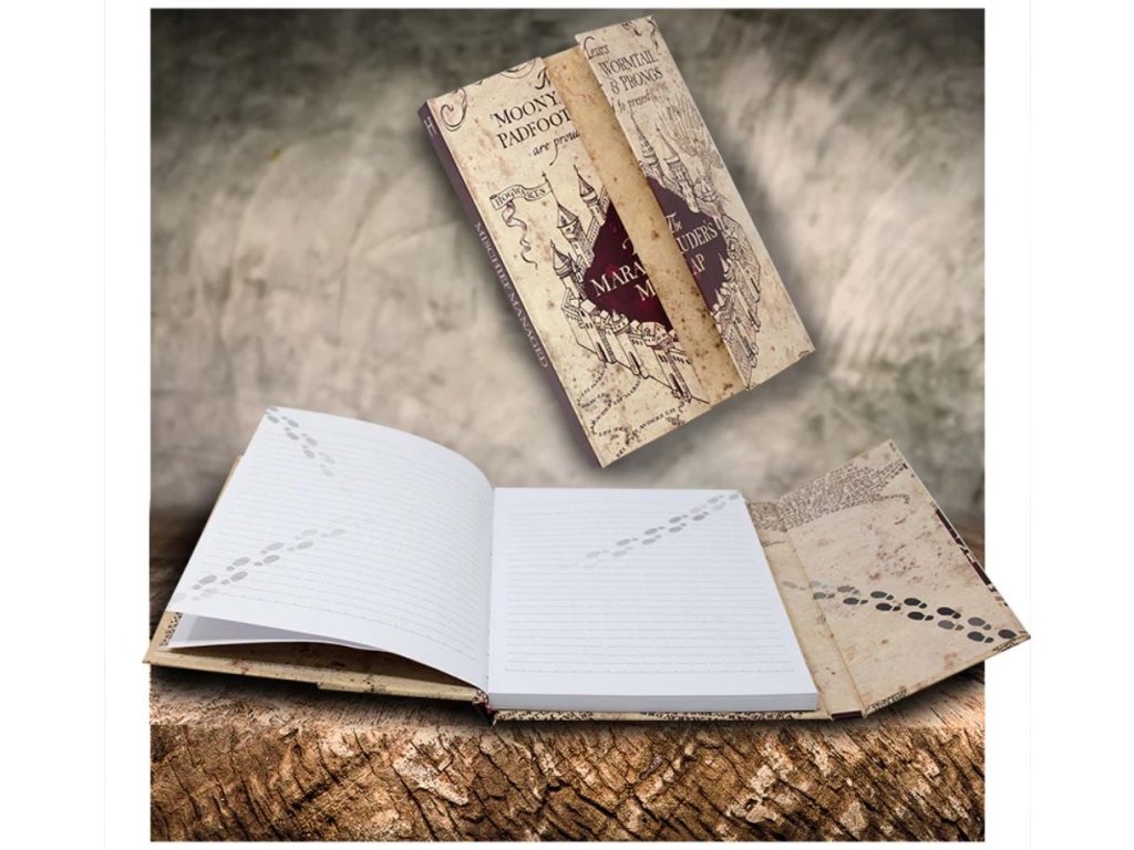 Poznámkový blok A5 s grafikou Pobertova plánku. Tento zápisník se otevírá jako mapa odhalující uvnitř linkovaný papír. Magnetický kryt, který se magicky zaklapne.