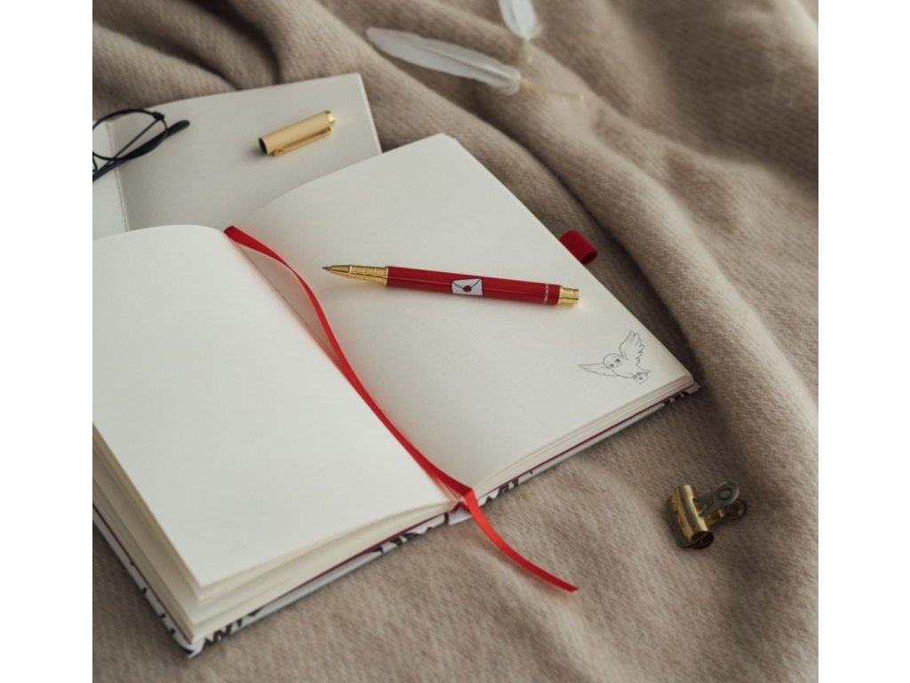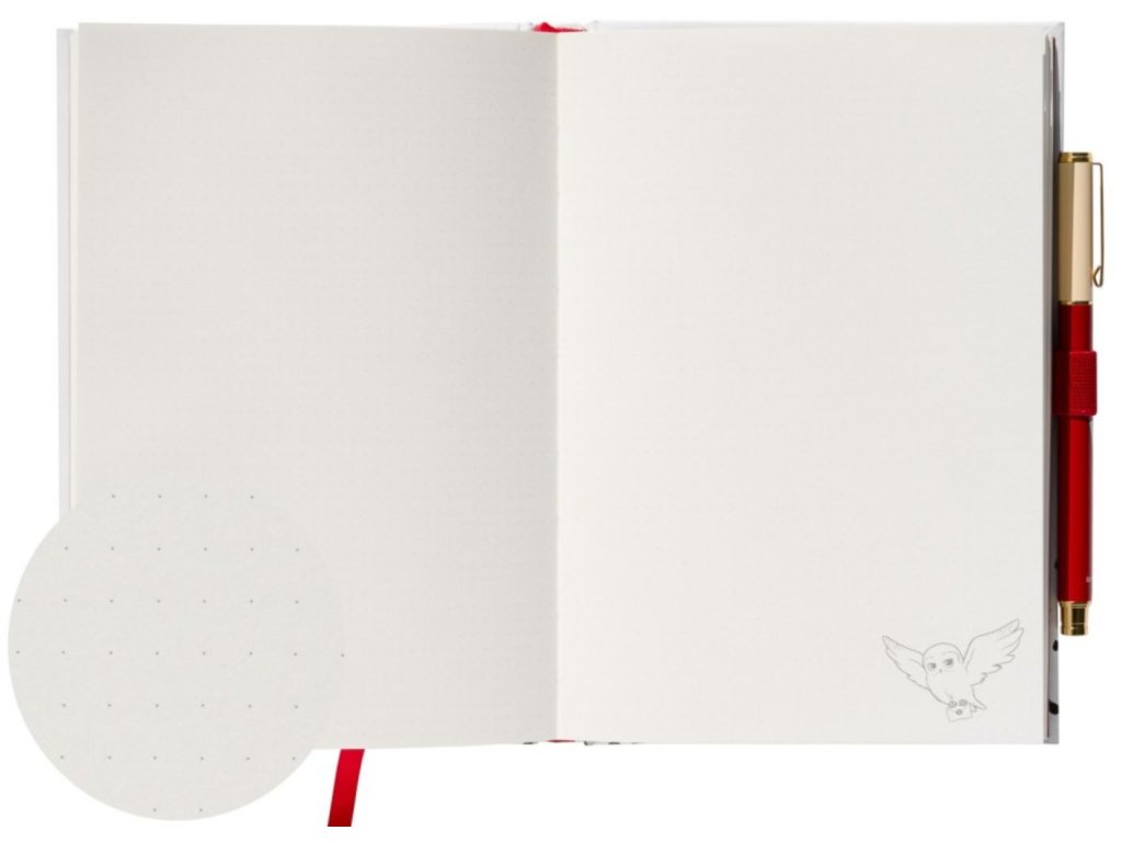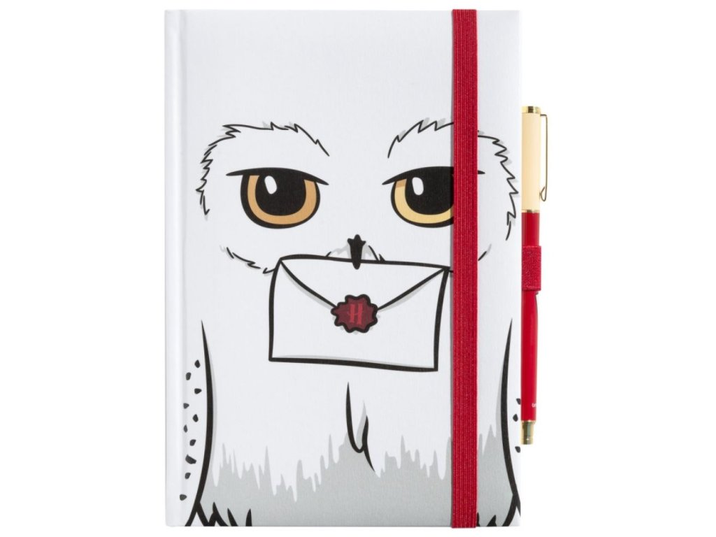 Zápisník ve formátu A5 v pevné vazbě s propiskou, vyvedený s grafikou sněžné sovy Hedviky. Blok má personalizovaný vnitřek, rovné rohy, lepenou vazbu, stuhu na záložku, kapsu a zapínání na magnetickou sponu. Obsahuje 96 listů (192 stran) gramáže 100 g/m2.