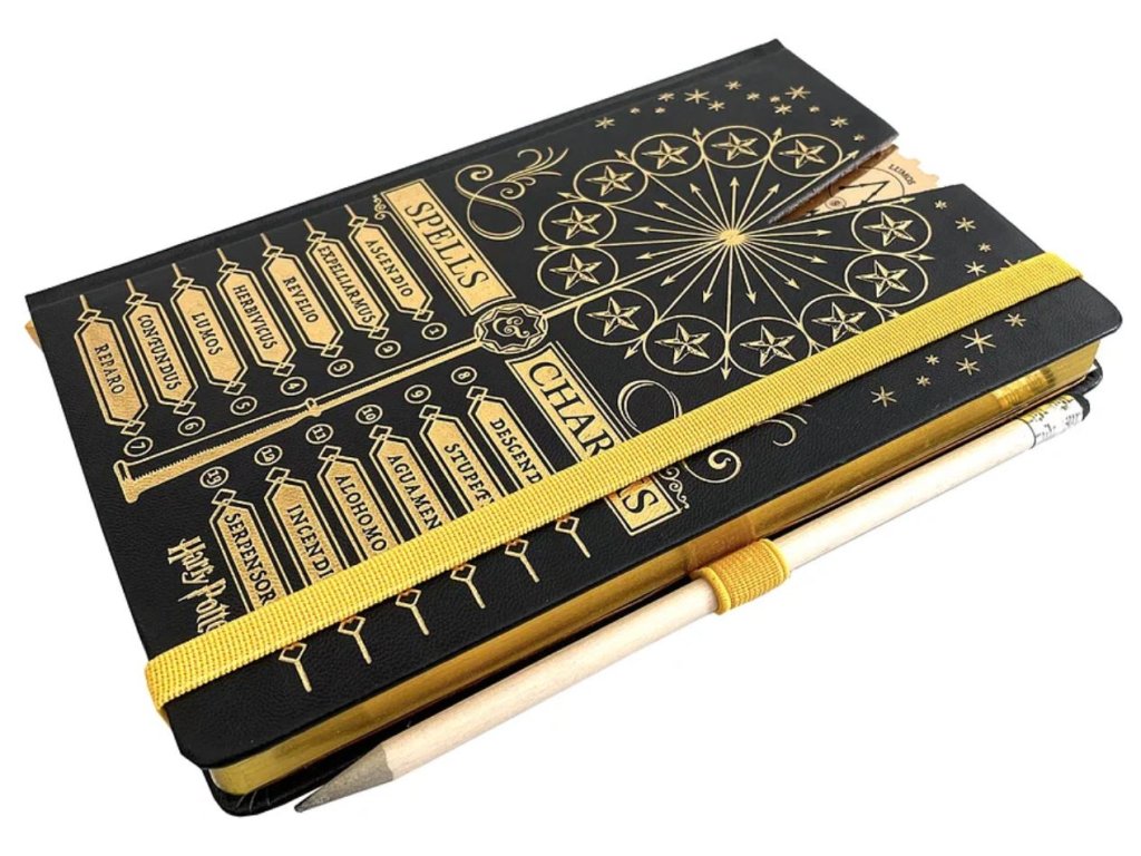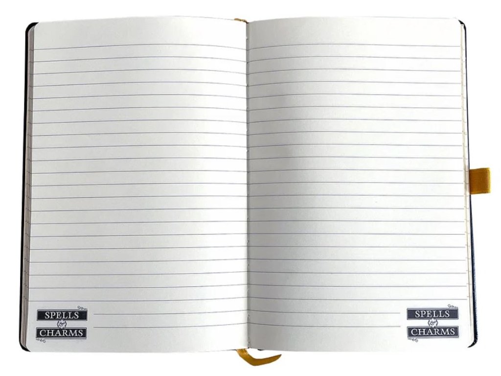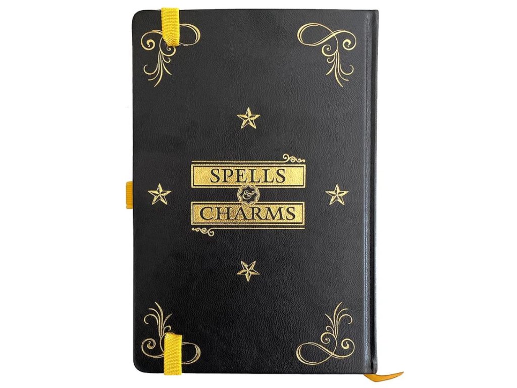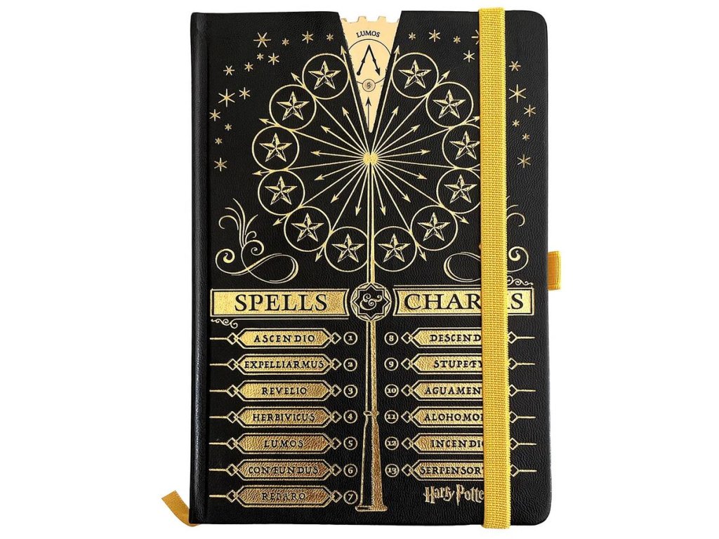 Originální zápisník pro čarodějky a mágy z Bradavic zdobí desky se známými kouzly ze světa Harryho Pottera. Linkovaný zápisník se zavírá pomocí gumičky, součástí je poutko pro tužku a všitá stužková záložka. Okouzlí vás zlaté zdobení na deskách z umělé kůže i na okrajích listů.. Na přední straně zápisníku se nachází seznam kouzel: například známé Expelliarmus, Lumos, Reparo a Ascendio.