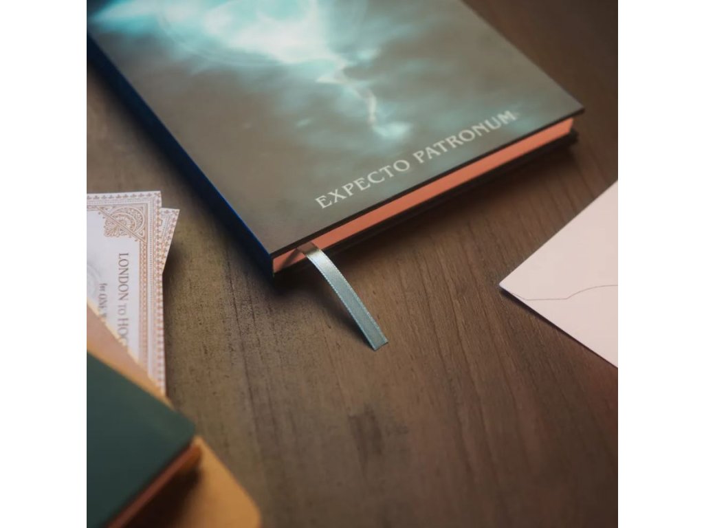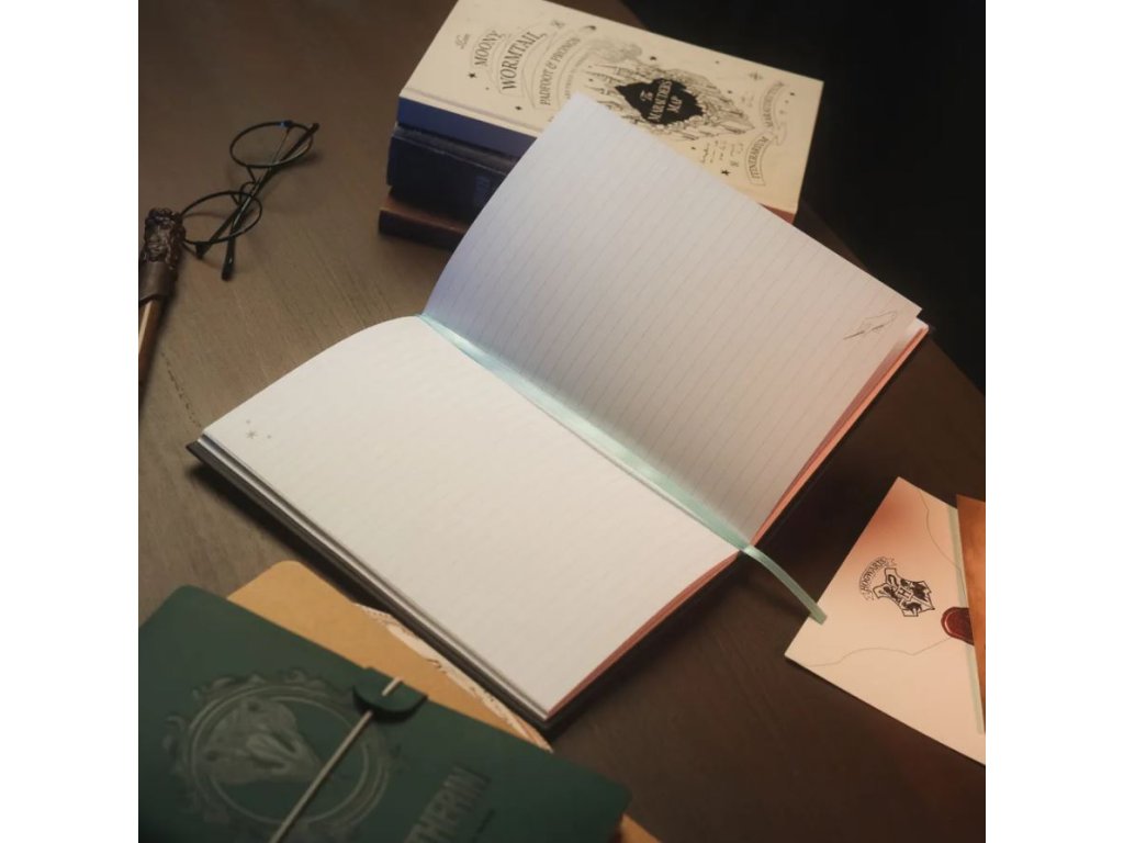 Zápisník ve formátu A5 s logem a grafikou kouzelnického světa Harryho Pottera. Přední strana je natištěna lentikulárním tiskem, tudíž blok při pohybu mění svůj design a vytváří tak dynamický obraz. Listy jsou linkované, s látkovou záložkou a kapsou například na jízdenky podthují atraktivitu zápisníku.