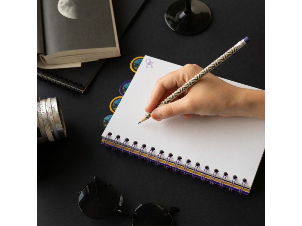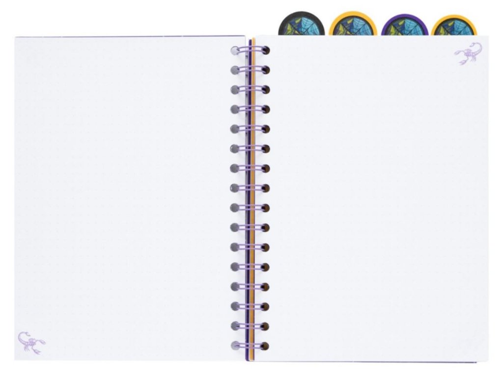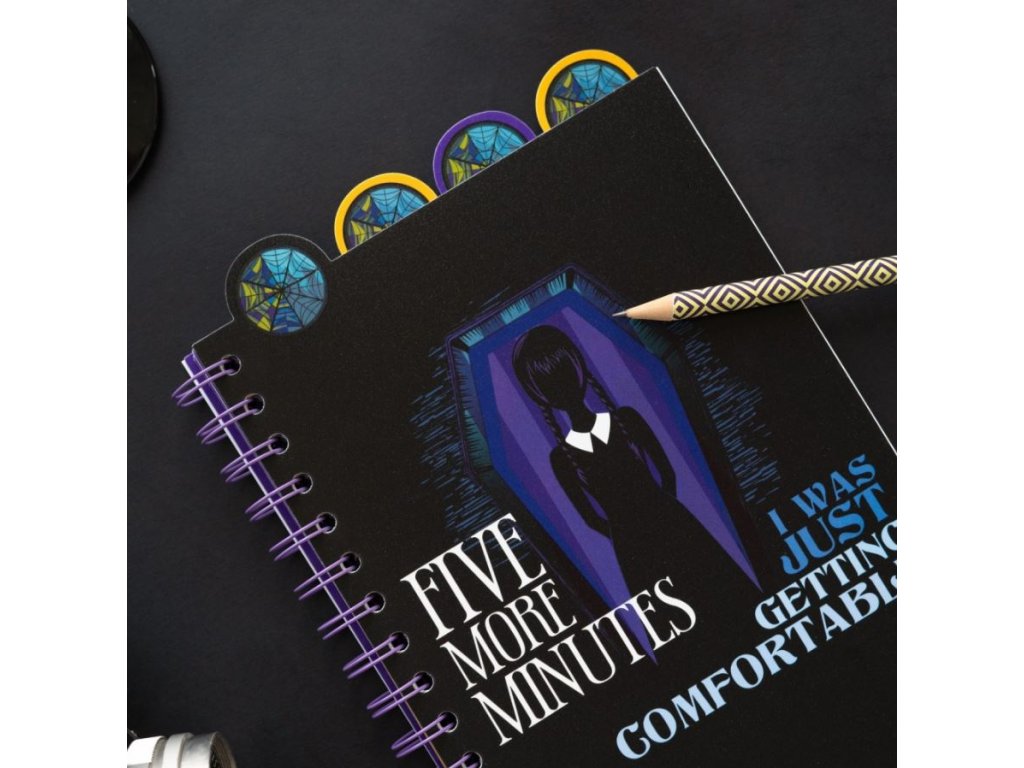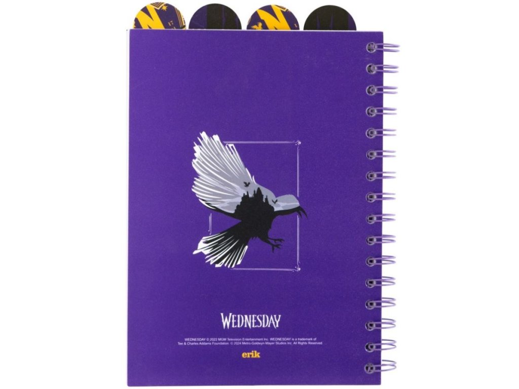 Blok ve formátu A5 v kroužkové vazbě s tečkovanými 80 listy (160 stran), inspirovaný hlavní postavou ze seriálu Wednesday. Součástí bloku jsou čtyři personalizované přepážky vyvedené podle hlavní postavy Wednesday. Zápisník je vhodným pomocníkem na zapisování všech poznámek pro každého fanouška tohoto oblíbeného seriálu.