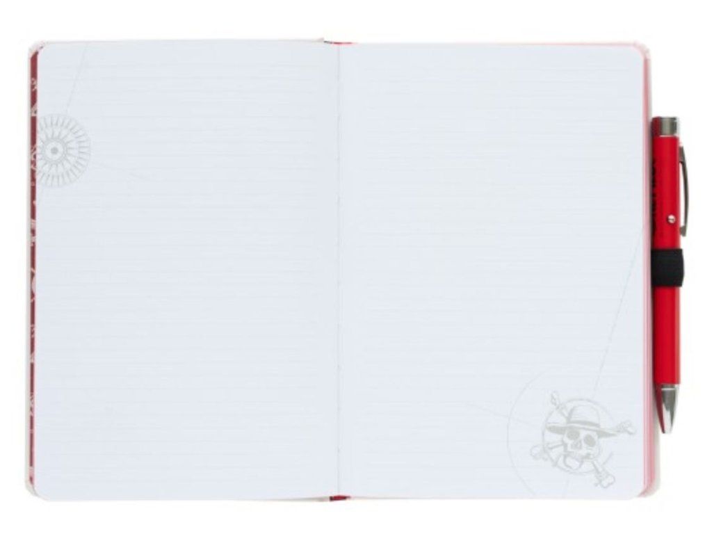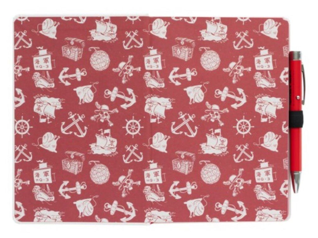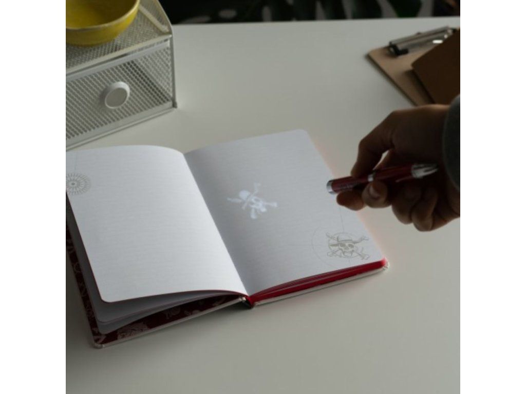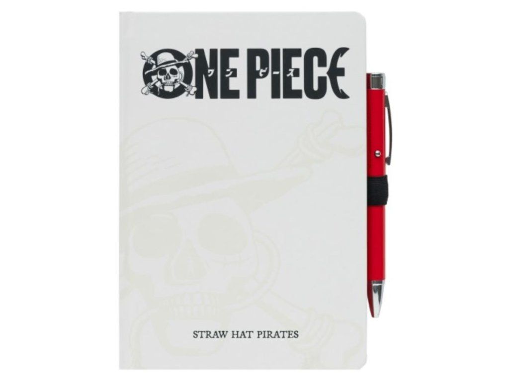 Prémiový zápisník velikosti A5 v pevné vazbě s propiskou a s potiskem nápisu Straw hat pirates a One Piece ze stejnojmenné japonské mangy. Blok obsahuje 96 linkovaných listů (192 stran), propisku s pirátským světýlkem, gumičku pro upevnění propisky a obálku na zadní pevné straně bloku. Zápisník je vhodný i jako dárek pro všechny fanoušky této japonské mangy a nesmí tak chybět žádnému pirátovi pro jeho poznámky.