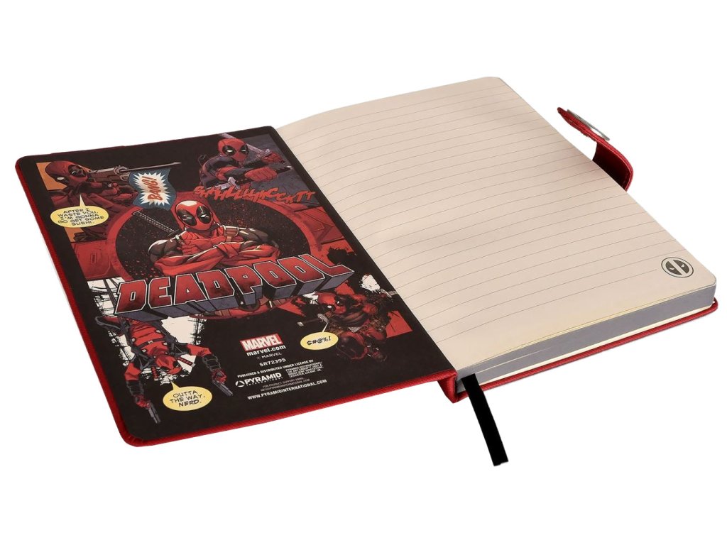 Zápisník ve formátu A5 s grafickým potiskem komiksu Deadpool na tvrdých deskách.