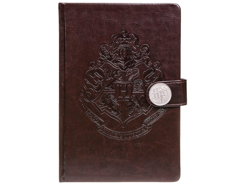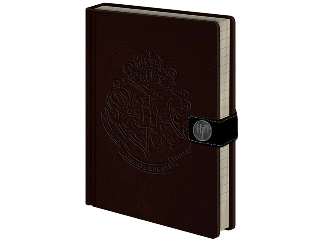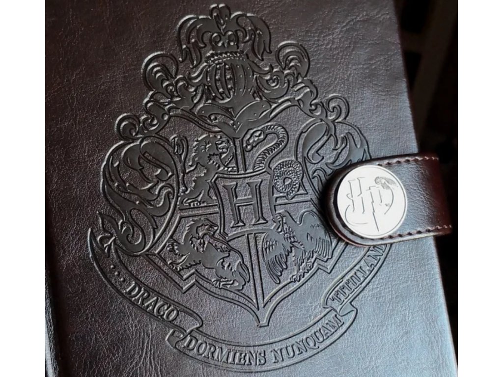 Zápisník v grafice kouzelnického světa v Bradavicích. Hnědý zápisník ve tvaru A5 s tvrdými deskami a zapínáním na magnet s iniciály HP jako Harry Potter. Na přední straně je do koženkového obalu vyrytý erb školy čar a kouzel v Bradavicích.