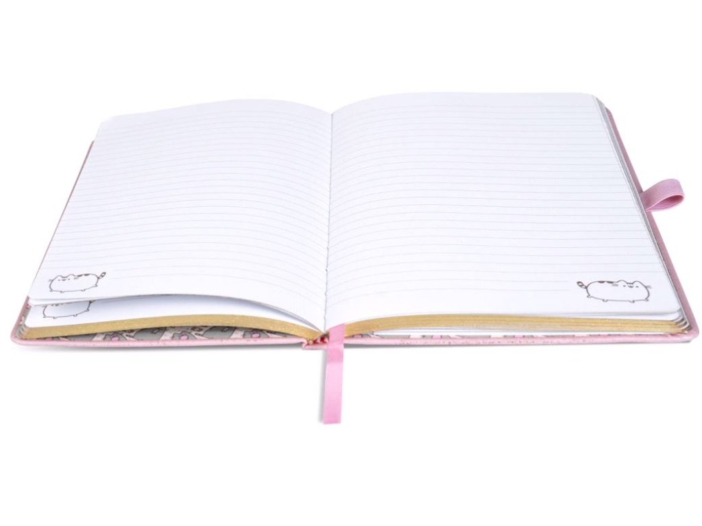 Růžový zápisník ve formátu A5 s tvrdými deskami a 120 linkovanými stránkami s grafickou kočky Pusheen.