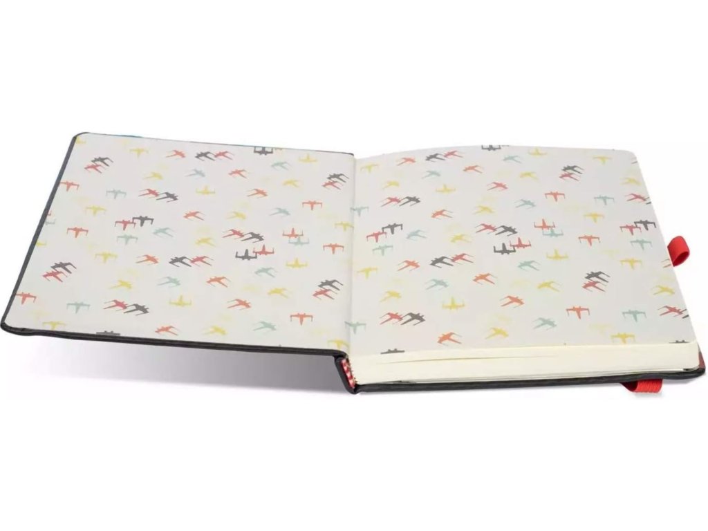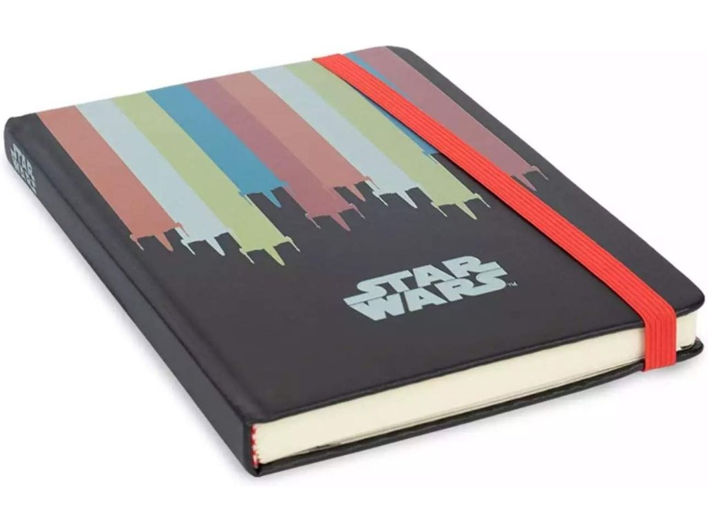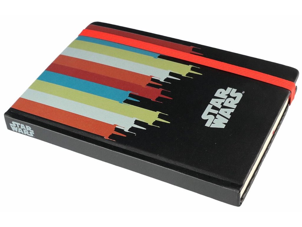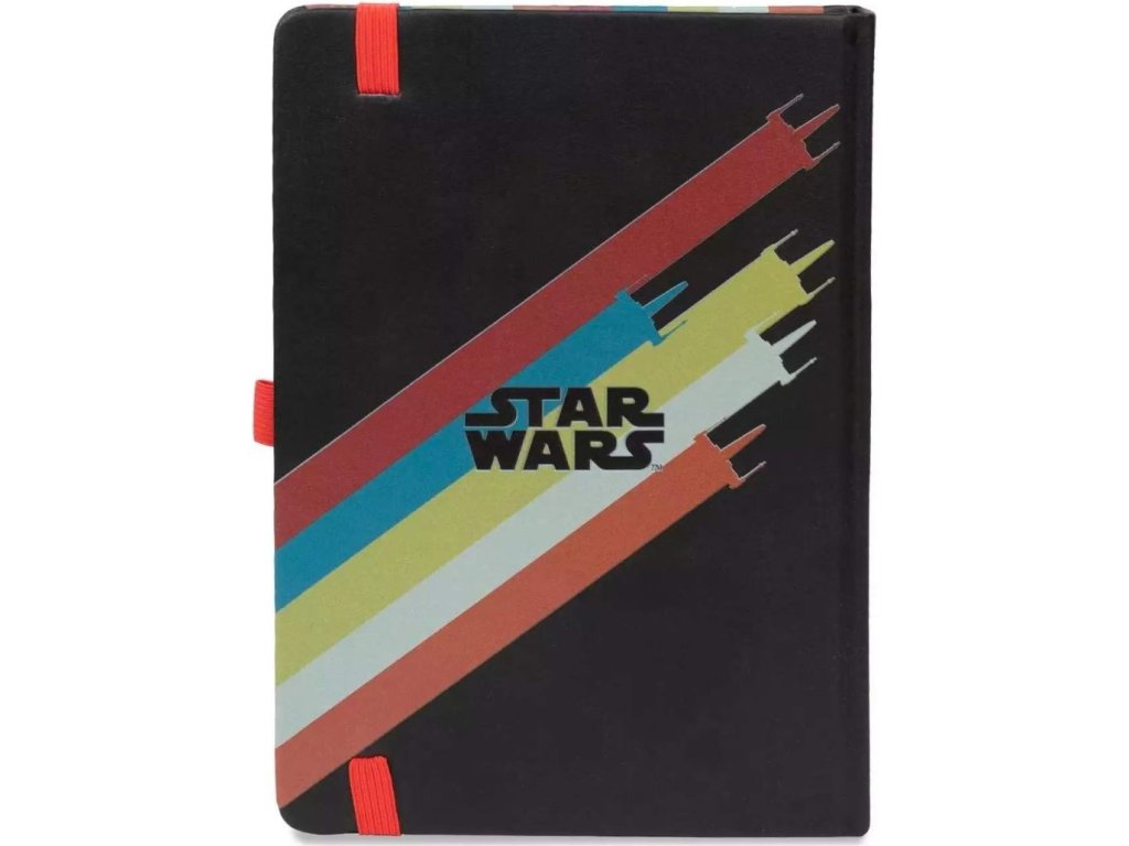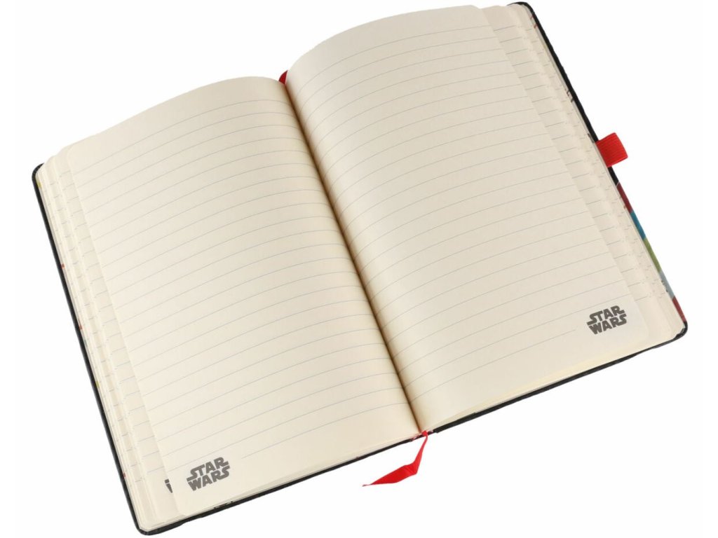 Zápisník ve formátu A5 s linkovanými listy a pevnou vazbou vyvedenou z grafiky Star Wars. Disponuje gumičkou proti otevření celého zápisníku a gumičkou na propisku. Obsahuje i personalizovanou obalku na zadní straně bloku. Zápisník je vhodný na poznámky pro všechny fanoušky Star Wars.