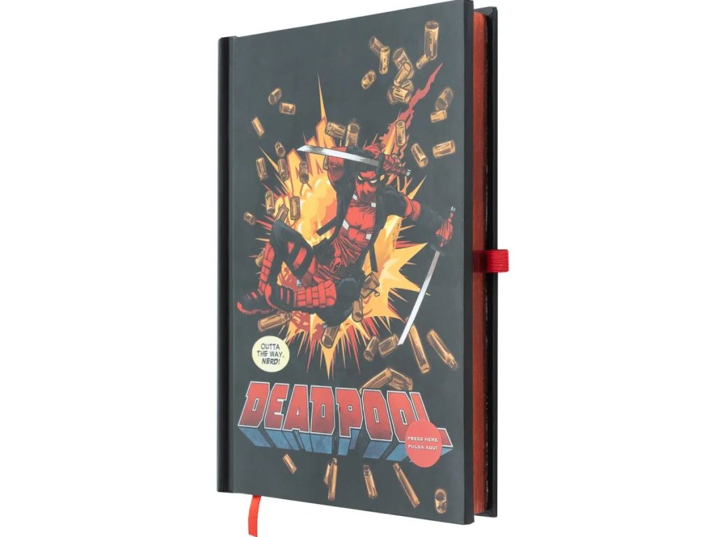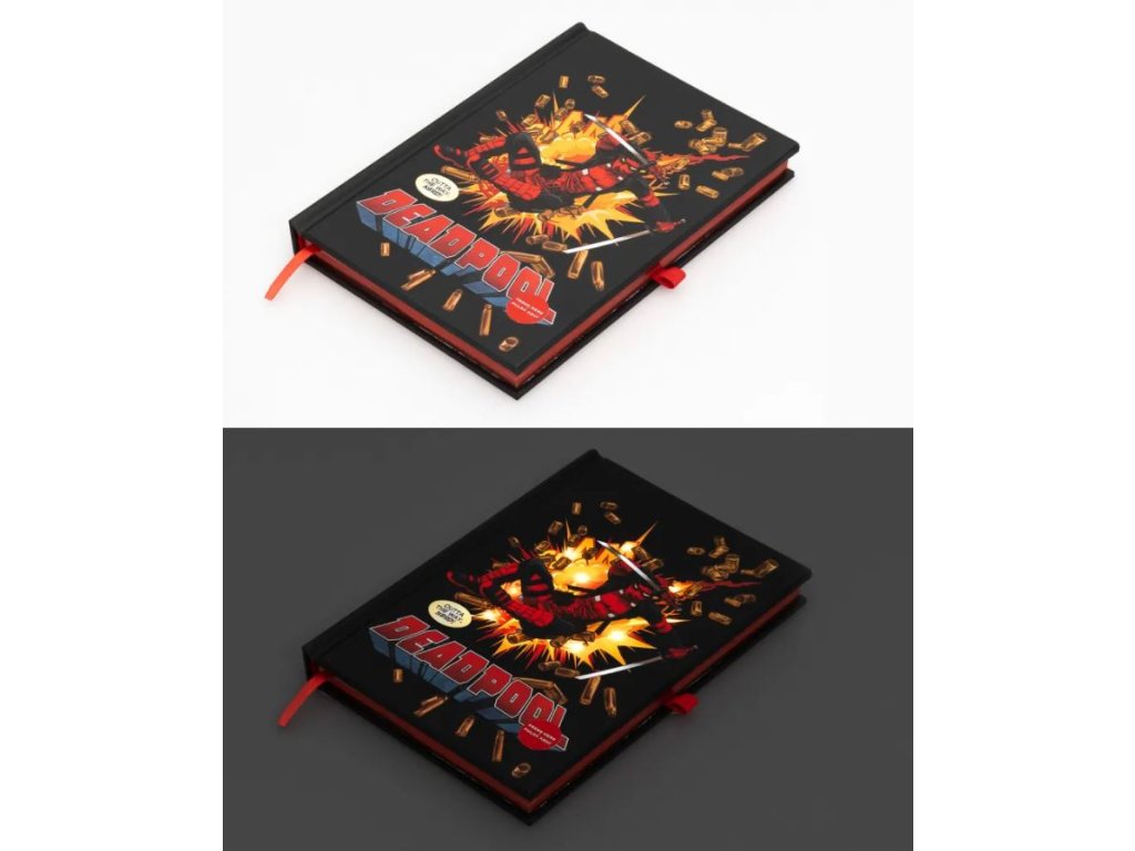 Prémiový zápisník s podsvícením o velikosti A5 v pevné vazbě a s potiskem superhrdiny Deadpool. Blok obsahuje 96 nelinkovaných listů (192 stran), látkovou záložku a obálku na zadní pevné straně bloku. Zápisník je vhodný i jako dárek pro všechny fanoušky tohoto superhrdiny a nesmí tak chybět žádnému velkému fanouškovi pro jeho poznámky.