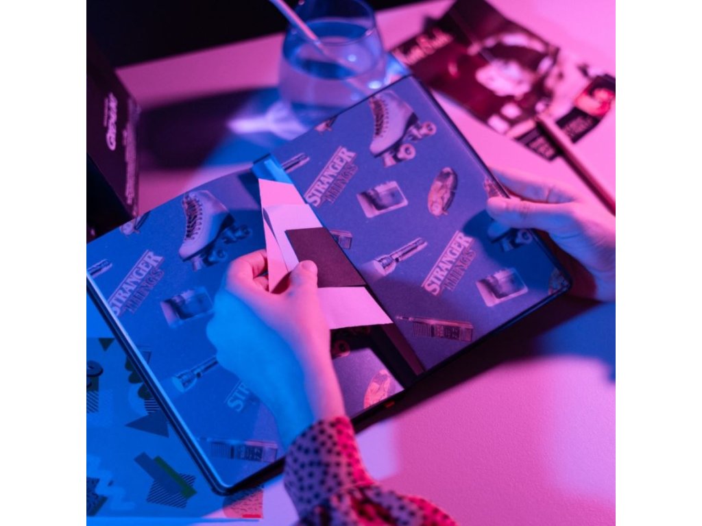 Oficiální produkt - zápisník z katalogu výrobků s logem, fotografiemi herců a grafikou slavného amerického seriálu Stranger Things od společnosti Netflix.