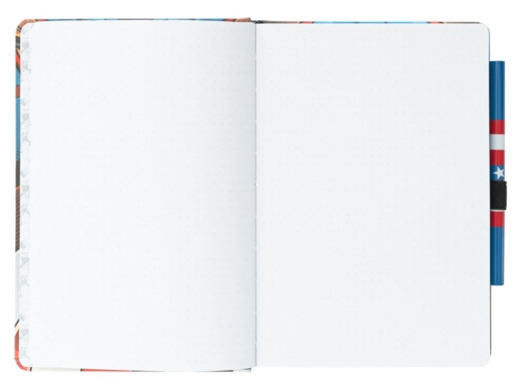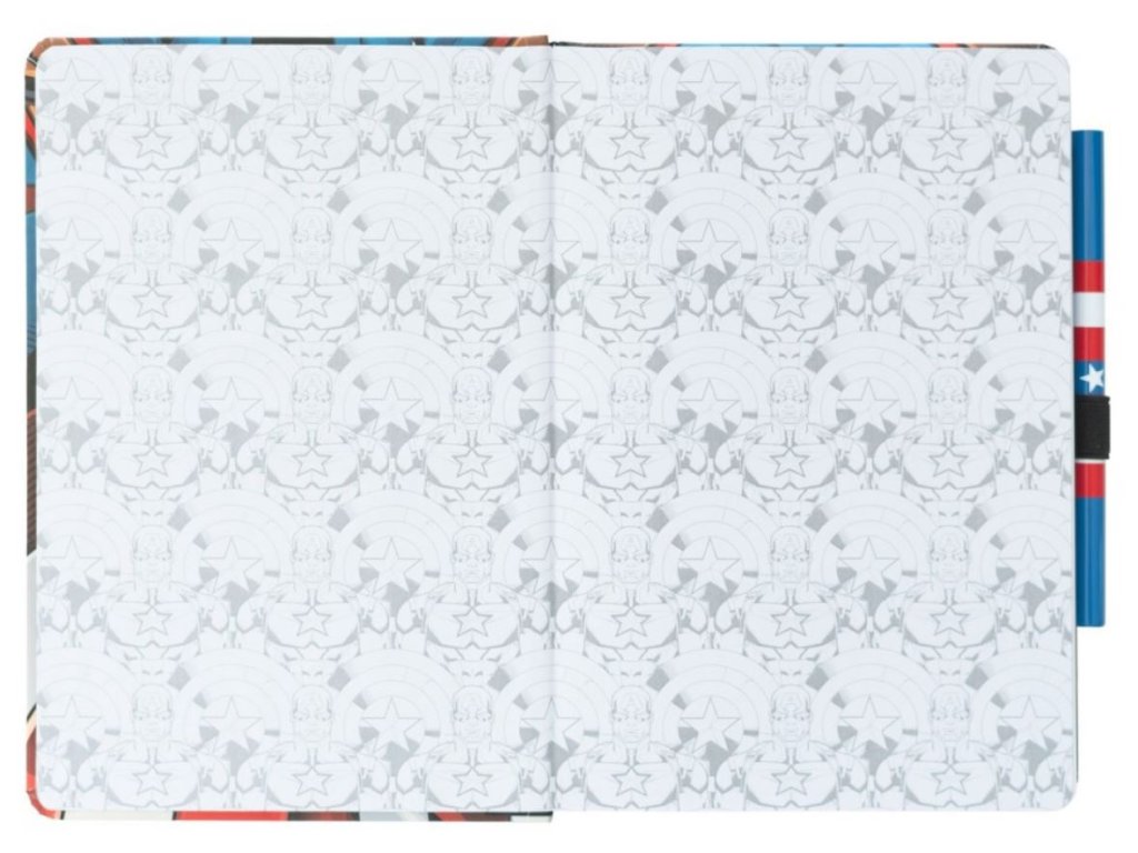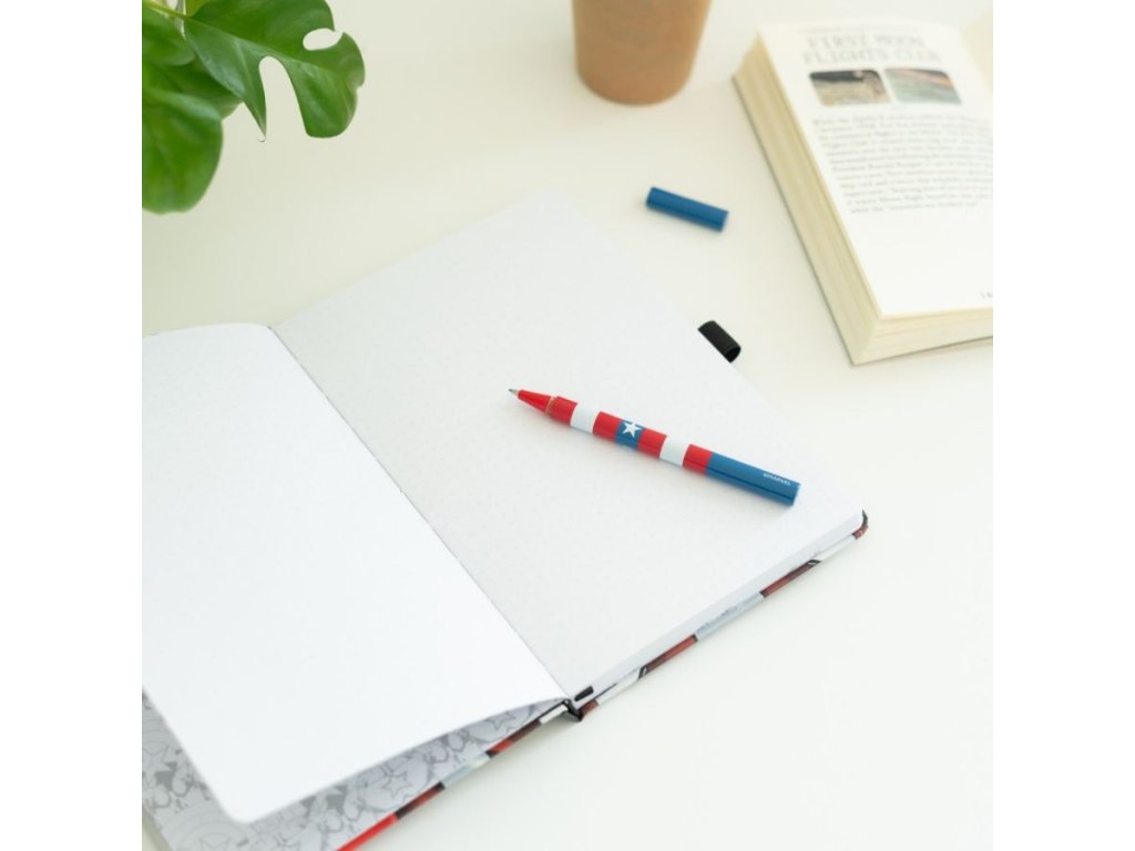 Prémiový zápisník velikosti A5 v pevné vazbě a s potiskem superhrdiny Captain America. Blok obsahuje 96 tečkovaných listů (192 stran), látkovou záložku a obálku na zadní pevné straně bloku. Zápisník je vhodný i jako dárek pro všechny fanoušky tohoto superhrdiny a nesmí tak chybět žádnému velkému fanouškovi pro jeho poznámky.