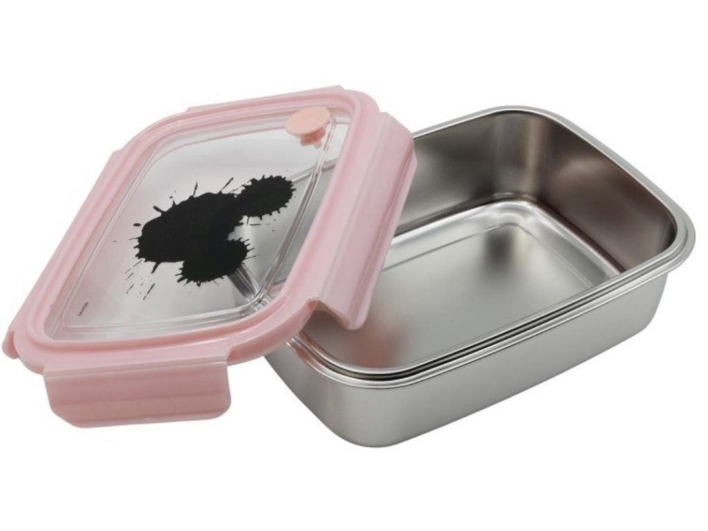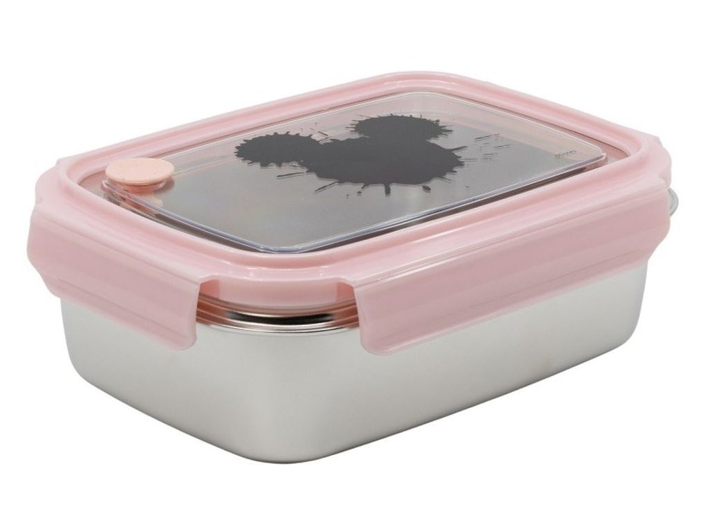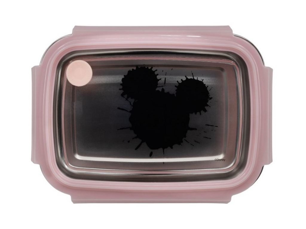 Nerezový svačinový box s uzávěrem a silikonovým těsněním vyvedený v motivu Mickey Mouse.
