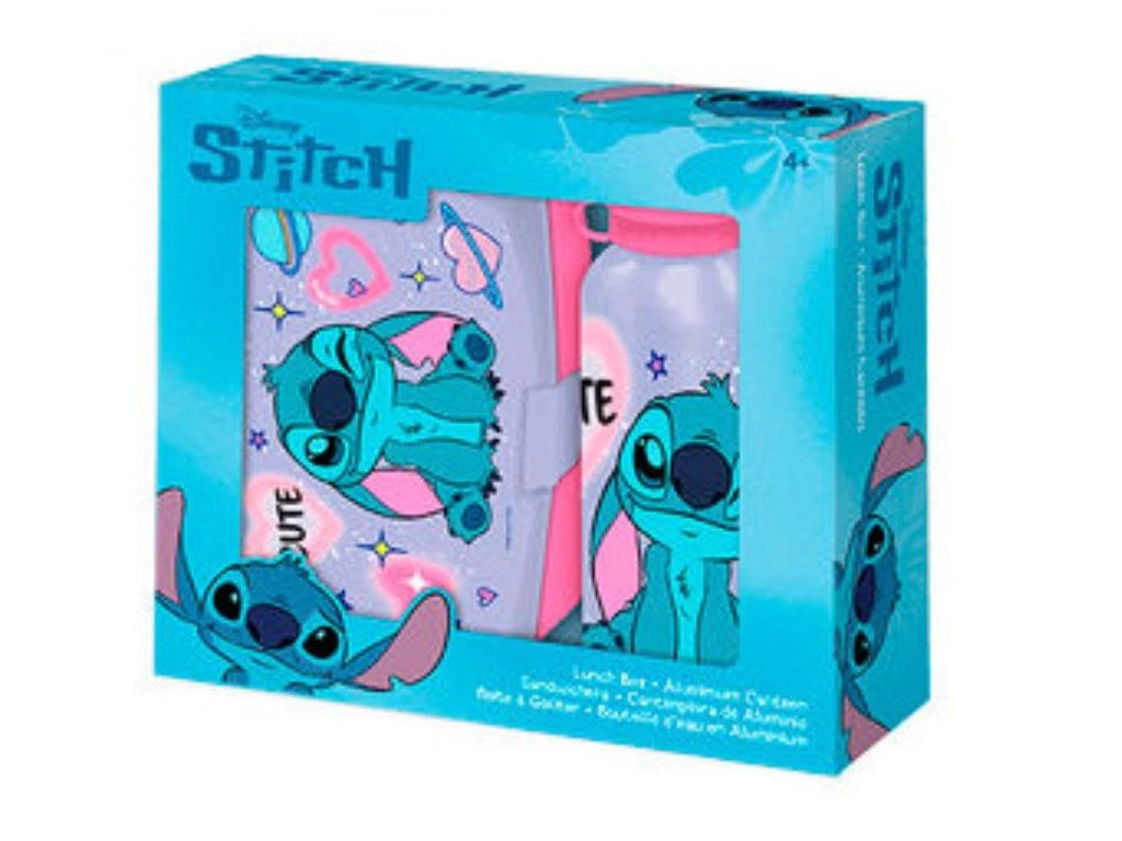 Oficiální produkt - dárkový set láhve a boxu na svačinu z katalogu výrobků s grafikou a licencí populární pohádky Lilo & Stitch od společnosti Disney.