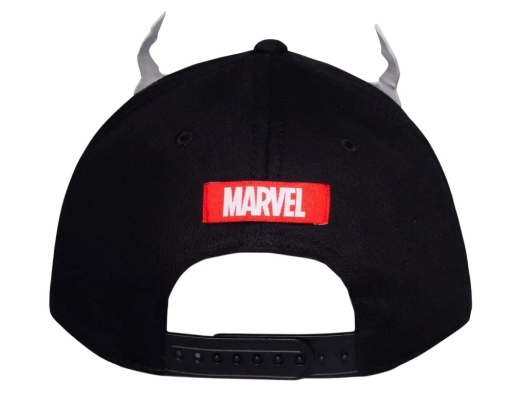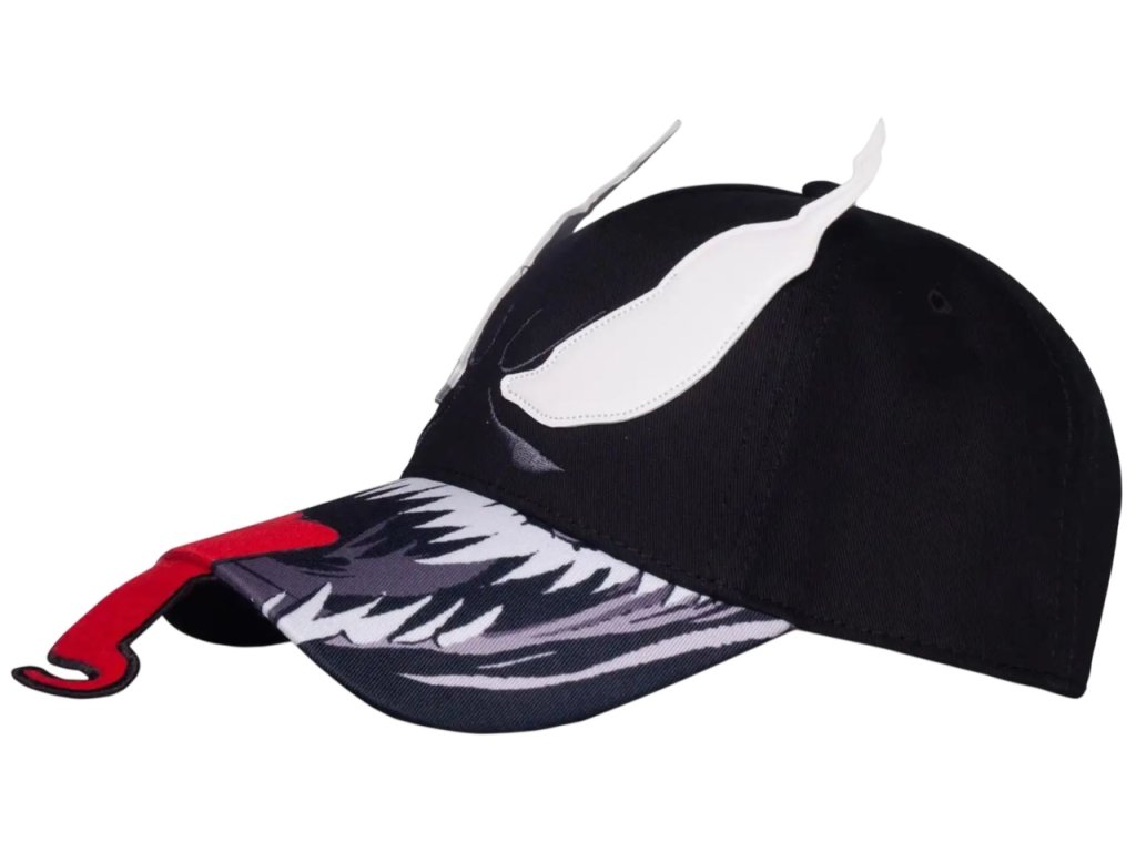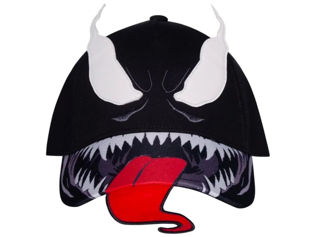 Prémiová černá baseballová kšiltovka s výrazným červeným jazykem, zuby, očima a logem Marvel a grafikou postavy Venoma. Kšiltovka je vzadu otevřená s poutkem na přizpůsobení velikosti. Malé červené logo komiksové společnosti Marvel zvýrazňuje kšiltovku i ze zadní části.