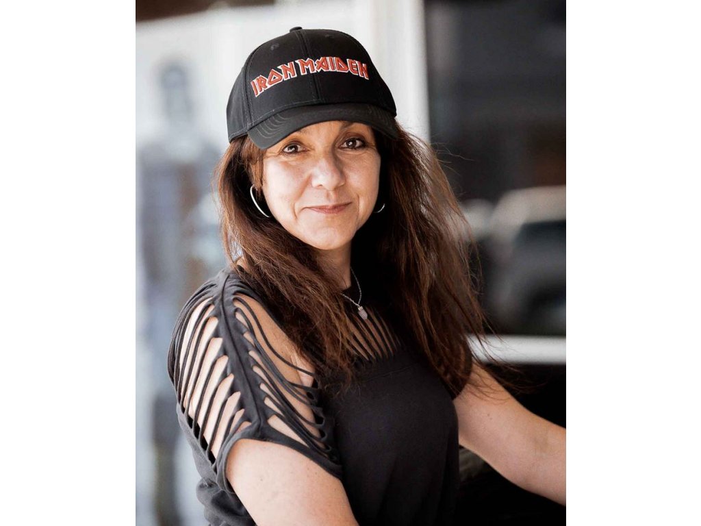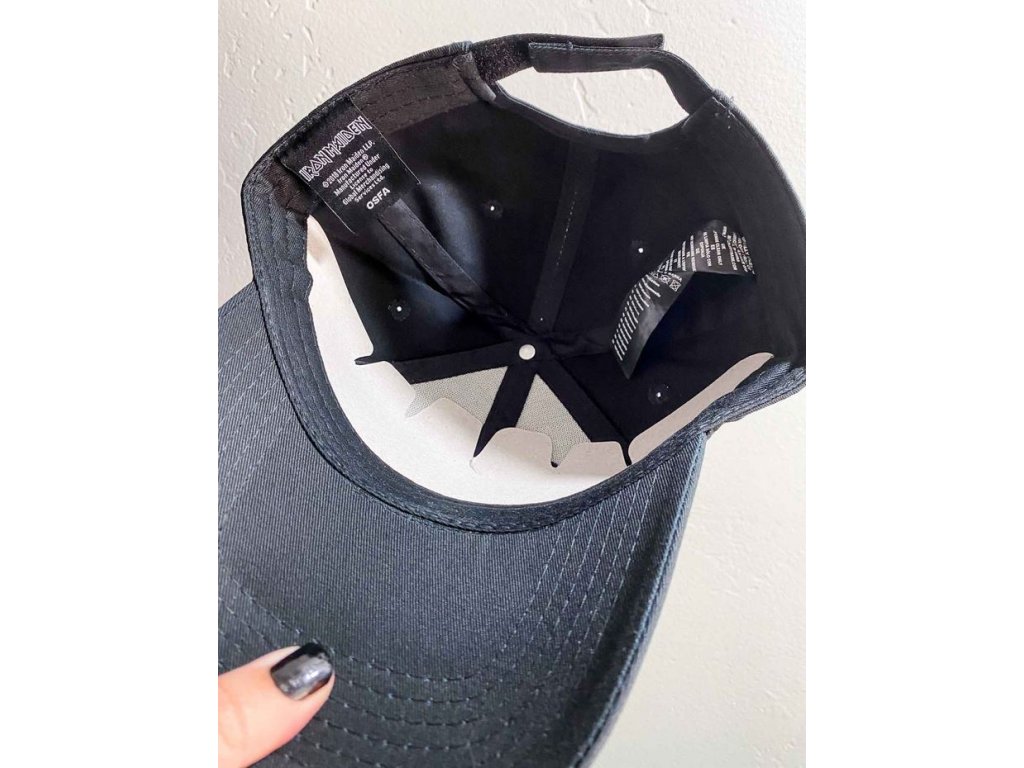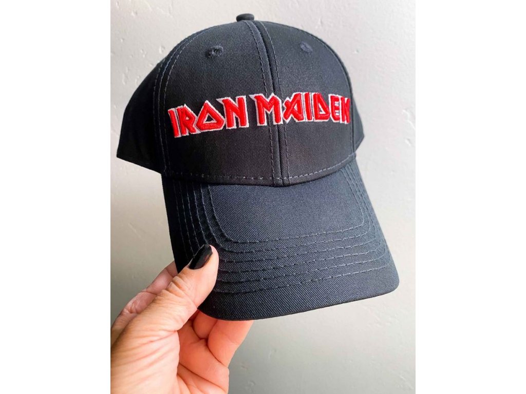 Oficiální kšiltovka z fashion katalogu módního a doplňkového zboží s logem, grafikou a fotografiemi chlapců britské hudební skupiny Iron Maiden.