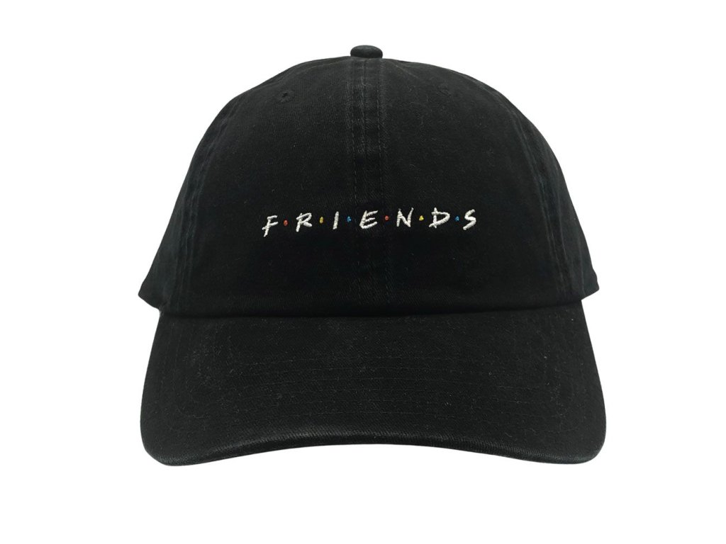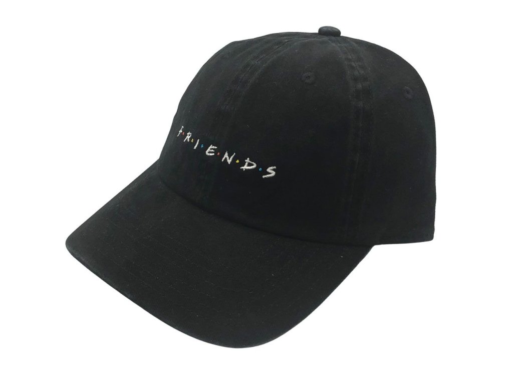 Černá kšiltovka s logem seriálu Friends. Kšiltovka má na zadní straně kovovou sponu, která slouží k nastavení požadované velikosti.