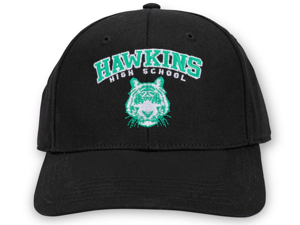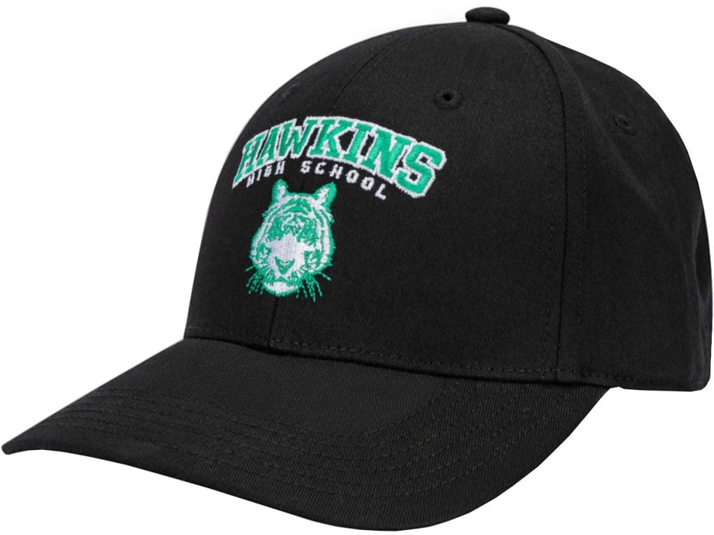 Černá baseballová kšiltovka s grafikou Hawkinsovy střední školy z populárního amerického seriálu Stranger Things.