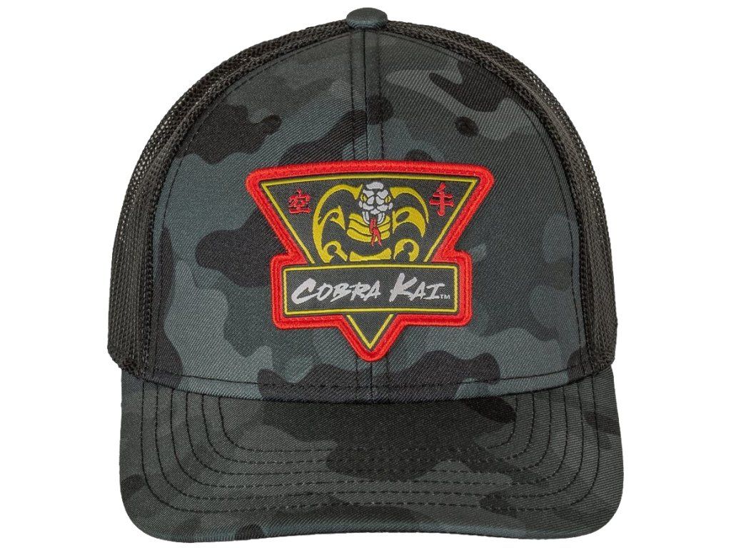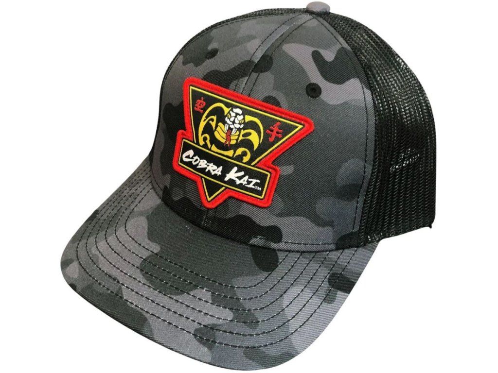 Černá baseballová kšiltovka s vojenským motivem a Camo Meshem ze seriálu Cobra Kai od streamovací společnosti Netflix.