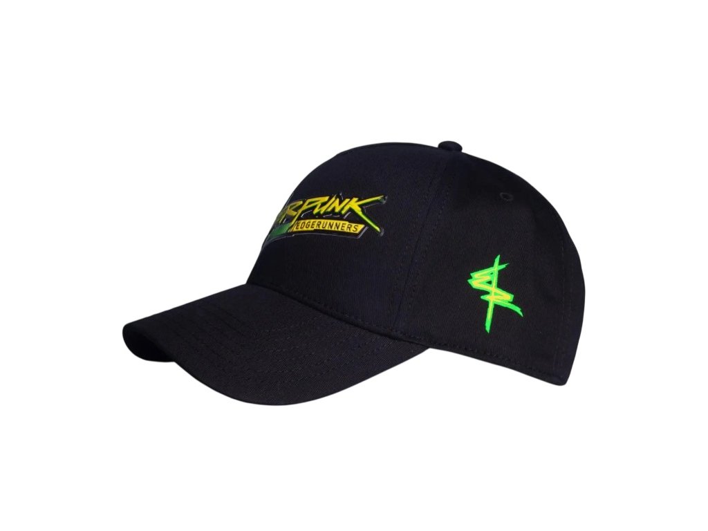 Oficiální produkt - baseballová kšiltovka z katalogu výrobků s logem a grafikou RPG videohry Cyberpunk 2077.