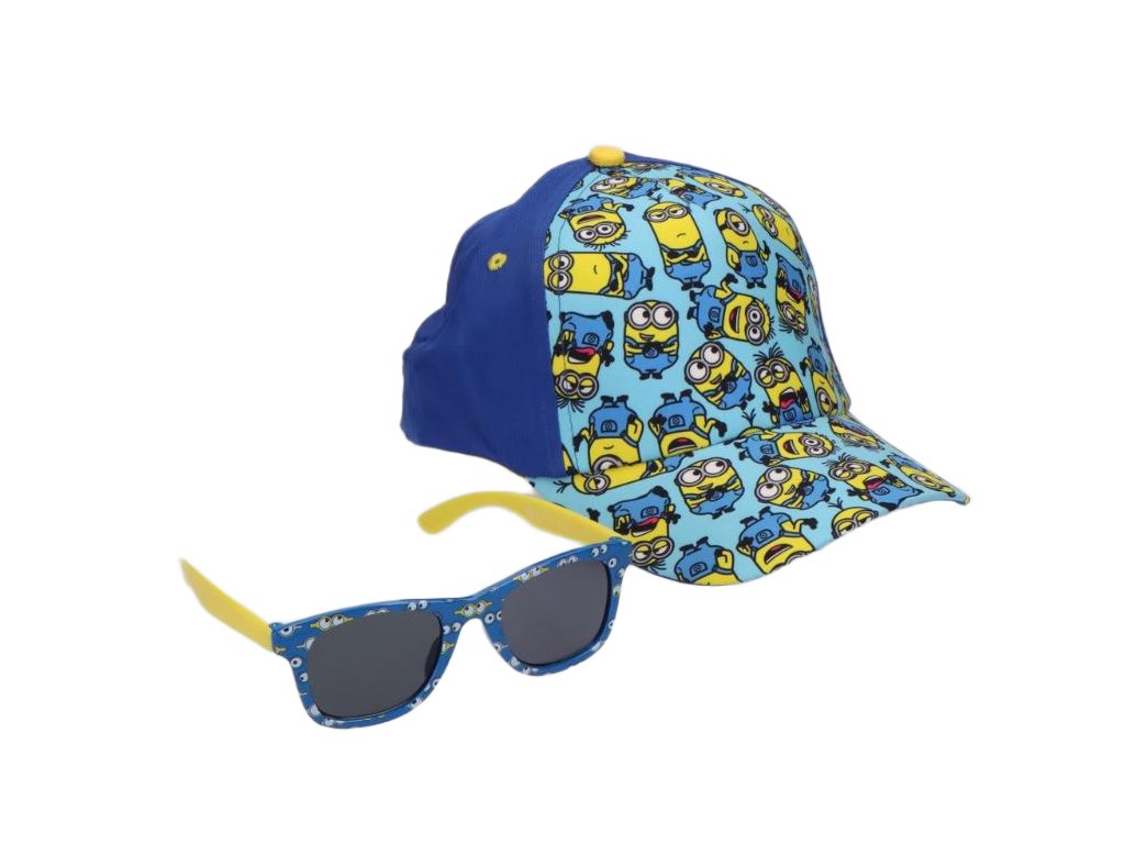 Baseballová čepice v modré barvě a s detaily inspirovanými žlutými postavičkami Mimoňů ze stejnojmenných filmů. Součástí setu jsou plastové dětské sluneční brýle ve stejném designu. Kšiltovka má vzadu nastavitelný řemínek na suchý zip. Tento dětský set se hodí i jako dárek pro každého malého fanoušky těchto žlutých komických postaviček.