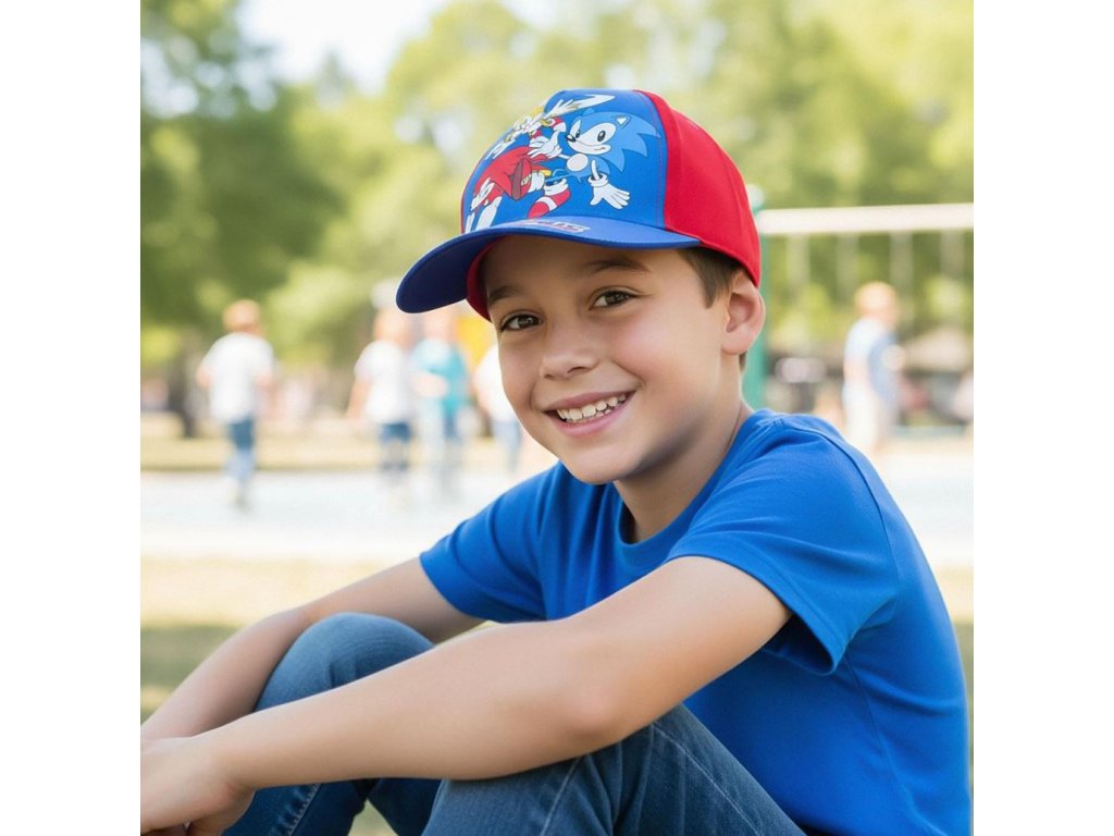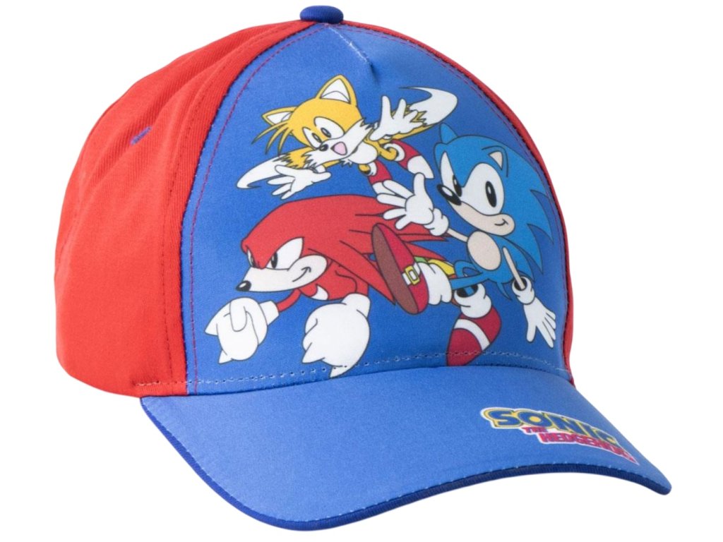 Dětská červeno-modrá baseballová kšiltovka s modrým kšiltem. Na kšiltovce je vyobrazen ježek Sonic s přáteli v akčních pózách. Zapínání je na látkový řemínek na zuchý zip, sloužící k upravování velikosti, tak aby čepice dokonale padla na každou hlavu malého fanouška těchto akčních postav.