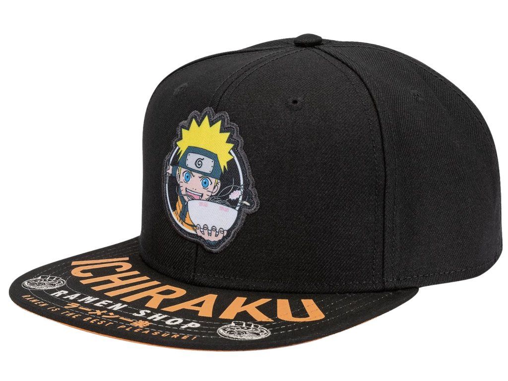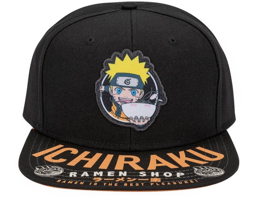 Černá snapback kšiltovka vyvedená s grafikou Naruto. Ukažte oblíbenou restauraci ramen Naruta Uzumakiho s touto nastavitelnou černo-oranžovou snapback čepicí pro dospělé. Obsahuje nášivku Naruto a slogan obchodu s ramenem na hledí. Tato čepice je vzadu otevřená a nastavitelná pro optimální a pohodlné nošení každého menšího i většího fanouška.