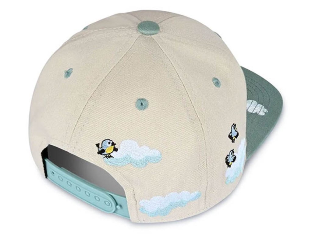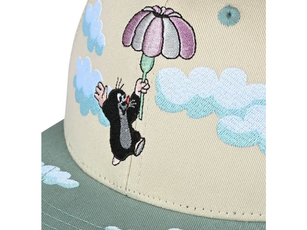 Dětská zelená kšiltovka s rovným zeleným kšiltem v béžové barvě. Nad kšiltem je vyšitá postavička Krtečka létajícího mezi mraky. NastavitelnáMateriál kšiltovky: Bavlna