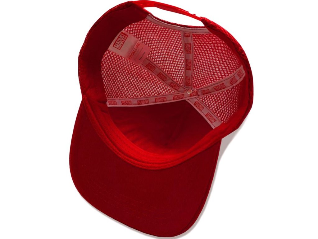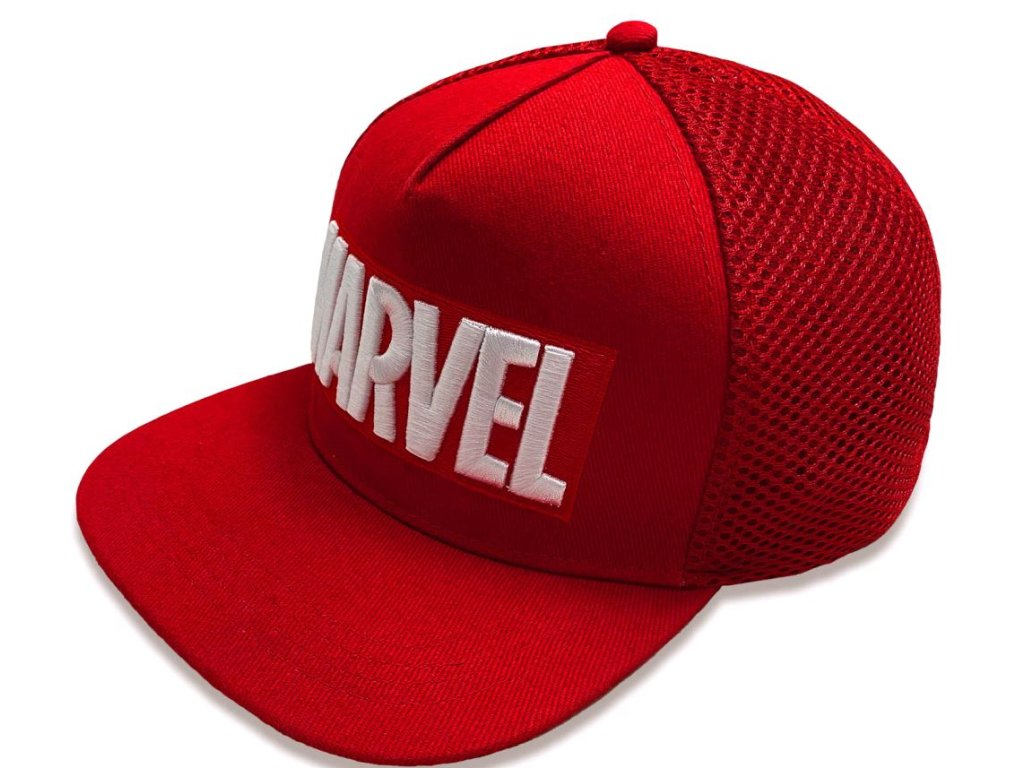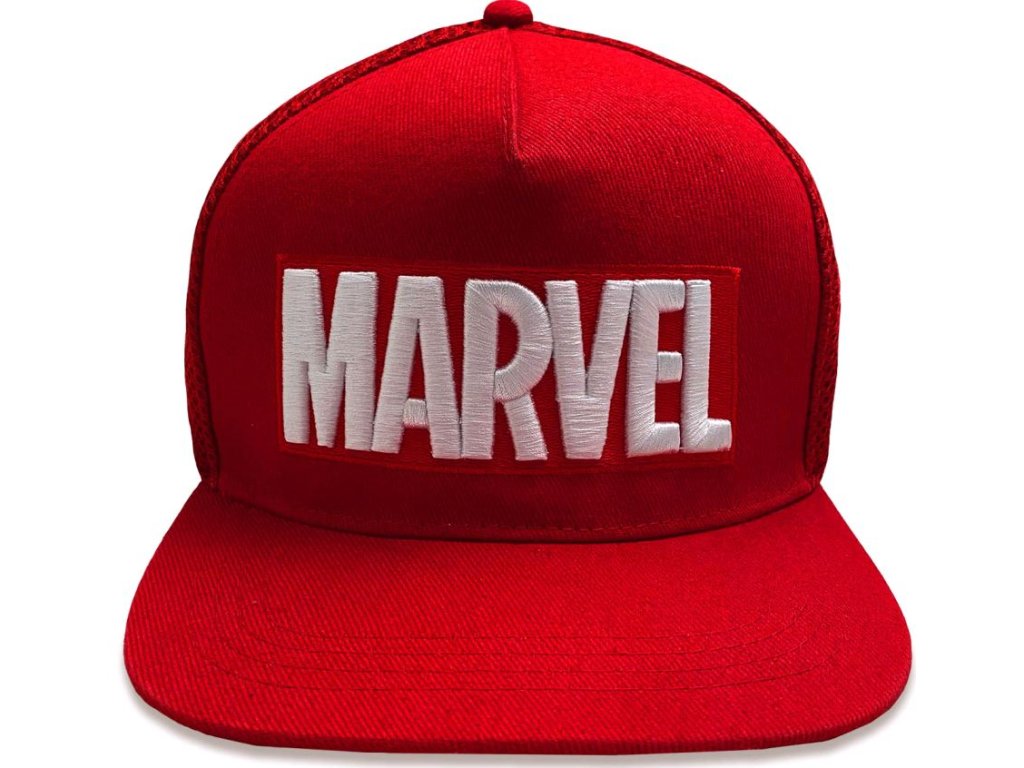 Atraktivní červená raperská kšiltovka s rovným kšiltem a logem studia Marvel.