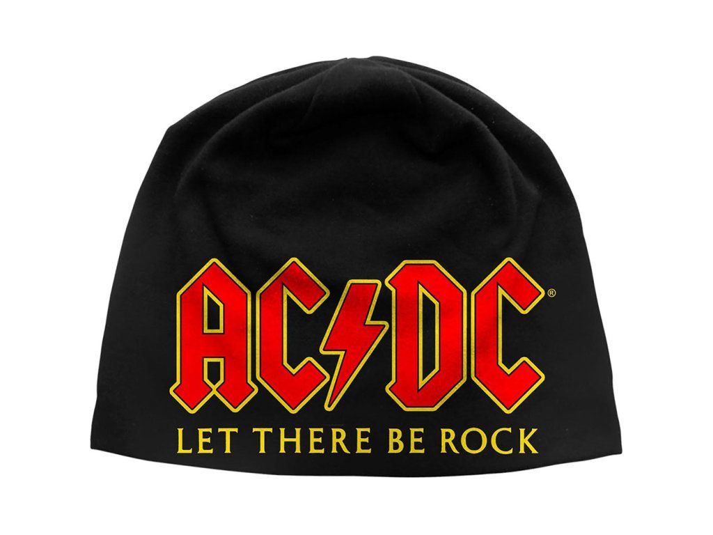 Černá lehká zimní čepice inspirovaná australskou hudební skupinou AC/DC a jejich logem s nápisem ,,Let There Be Rock".
