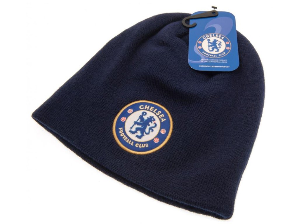 Zimní pletená čepice tmavě modré navy barvy s výraznou nášivkou znaku slavného fotbalového klubu FC Chelsea z Londýna.