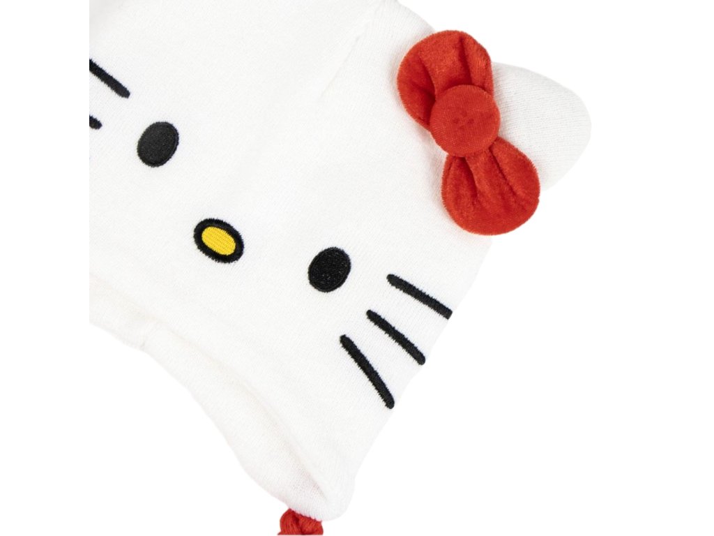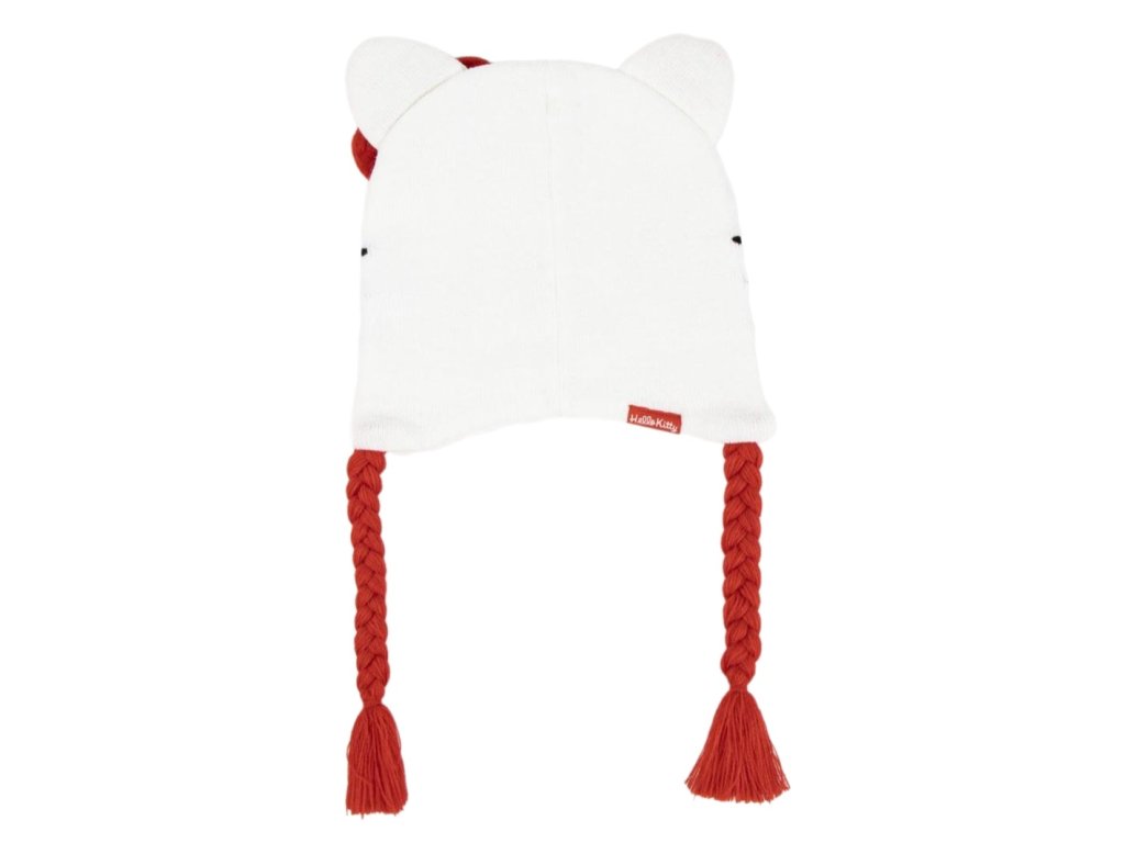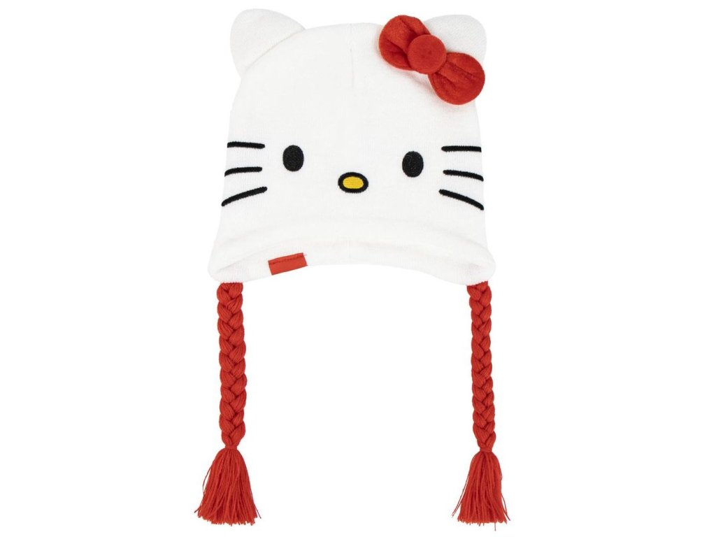 Oficiální produkt - zimní dětská čepice s copánky z katalogu výrobků s grafikou a licencí populárního seriálu a stejnojmenné kreslené kočky Hello Kitty.