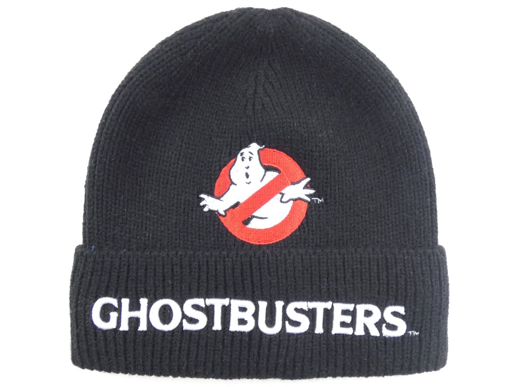 Černá zimní čepice s logem a motivem Ghostbusters.