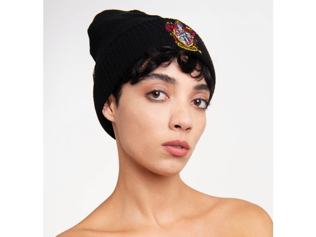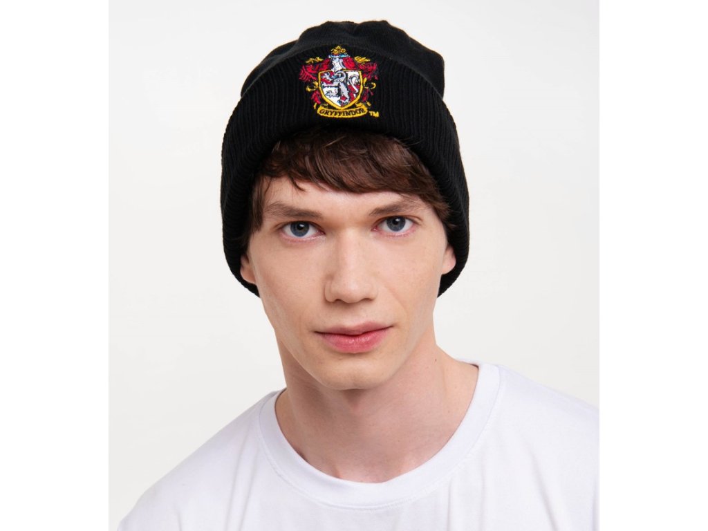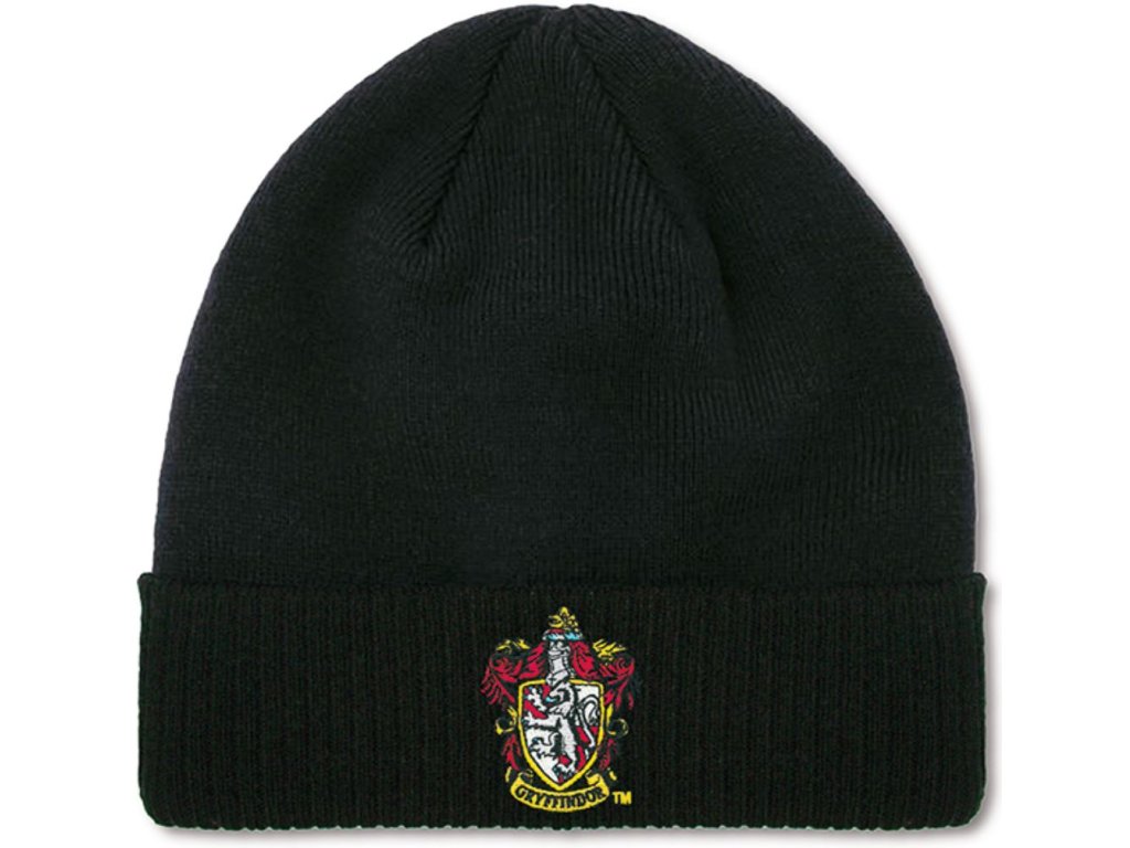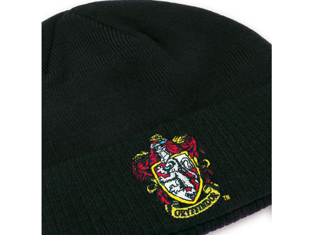 Černá zimní čepice se znakem koleje Gryffindor (Nebelvír) z filmové ságy Harryho Pottera.