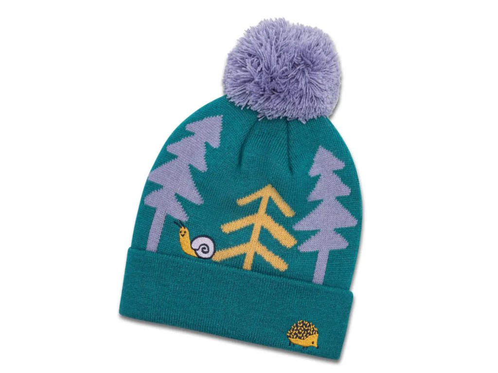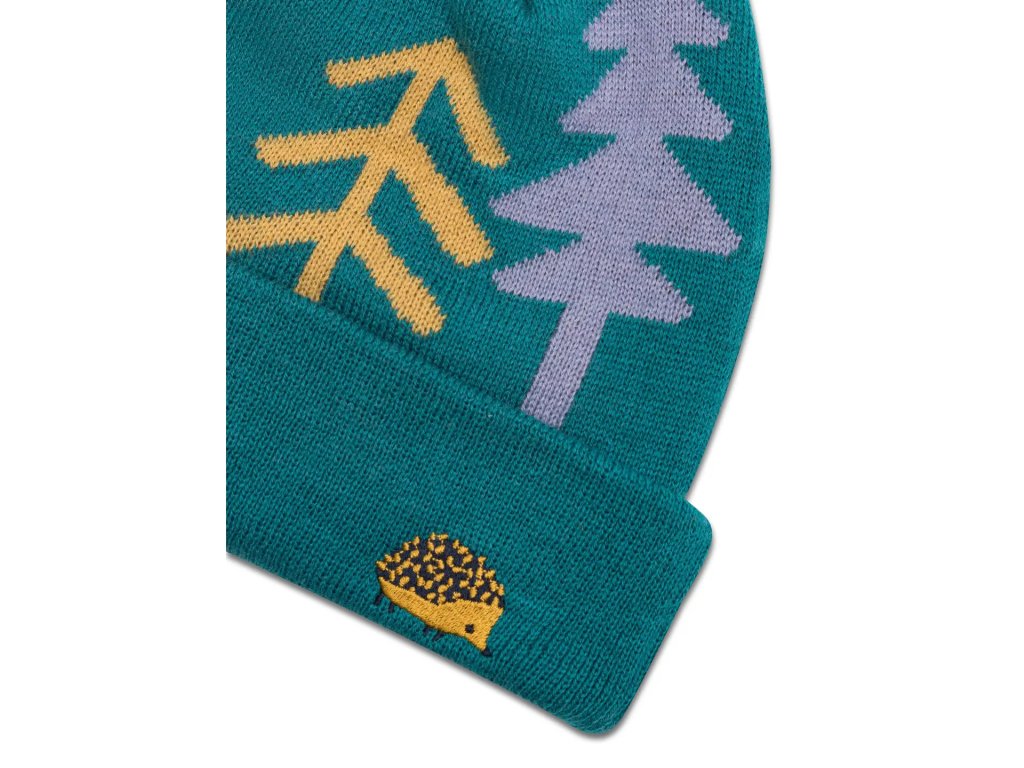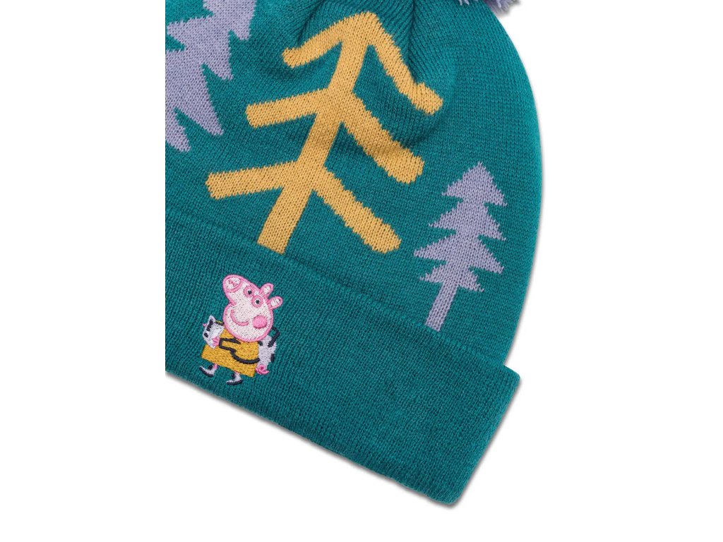 Zimní čepice s bambulí v zelené barvě s vyšitým motivem Prasátka Pepy s batohem a mapou. Kulich zdobí lesní pozadí s barevnými detaily.