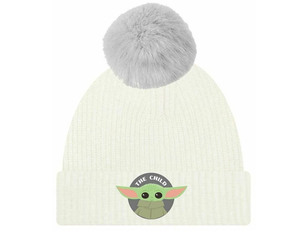 Bílá zimní čepice s bambulí a motivem Child Badge.