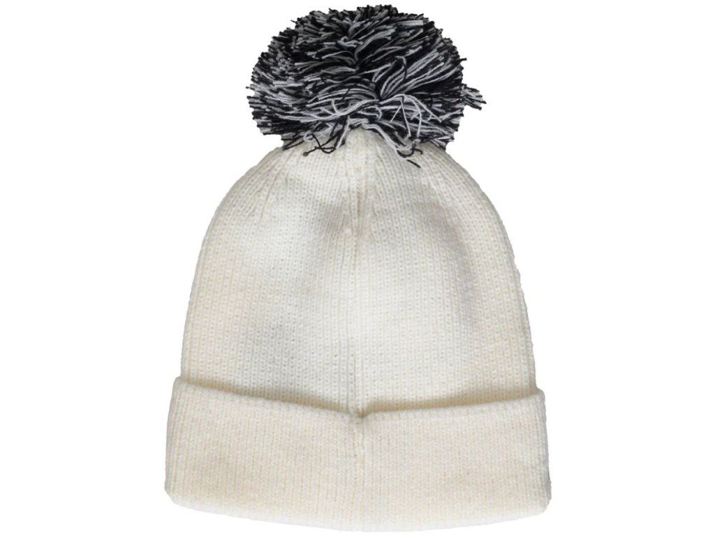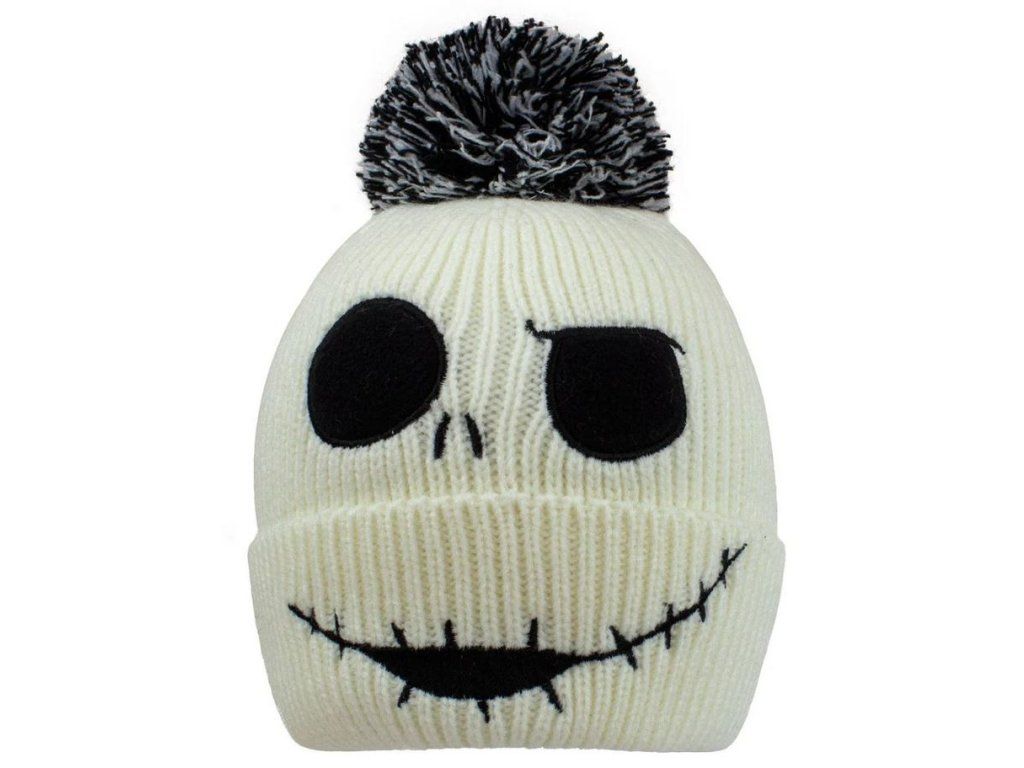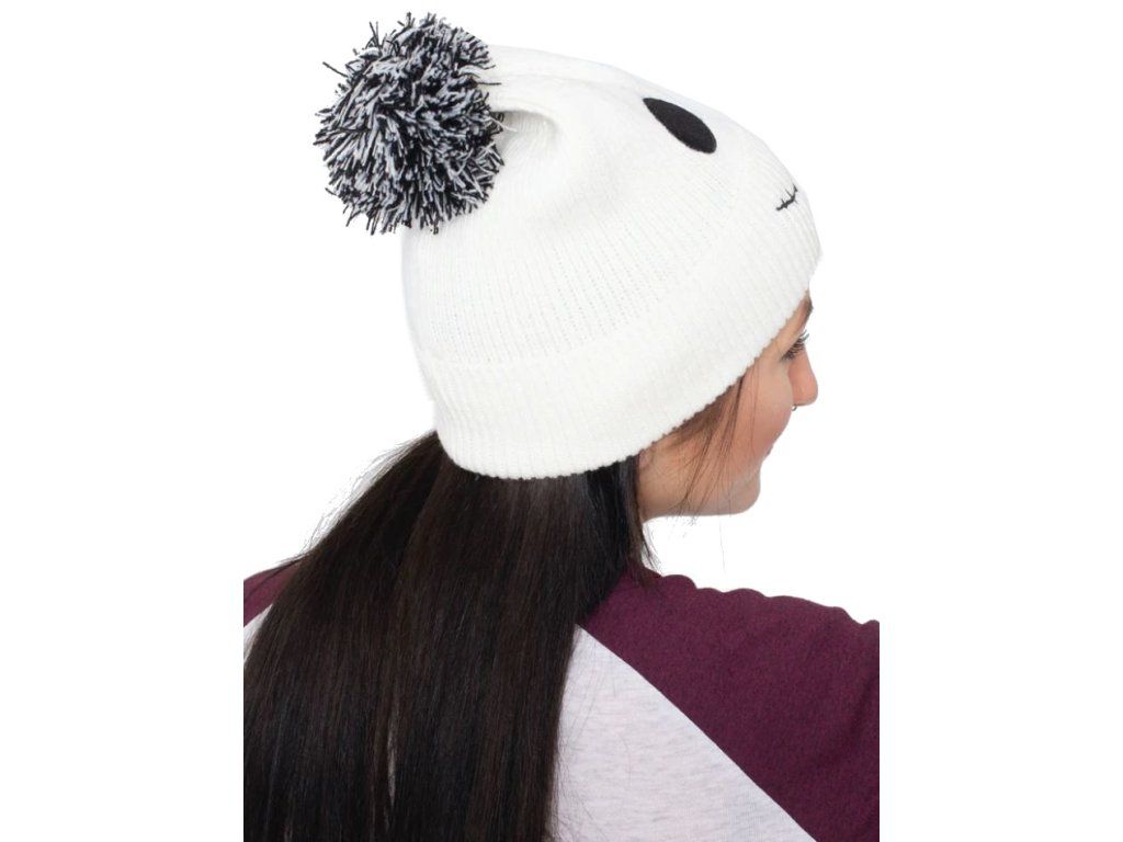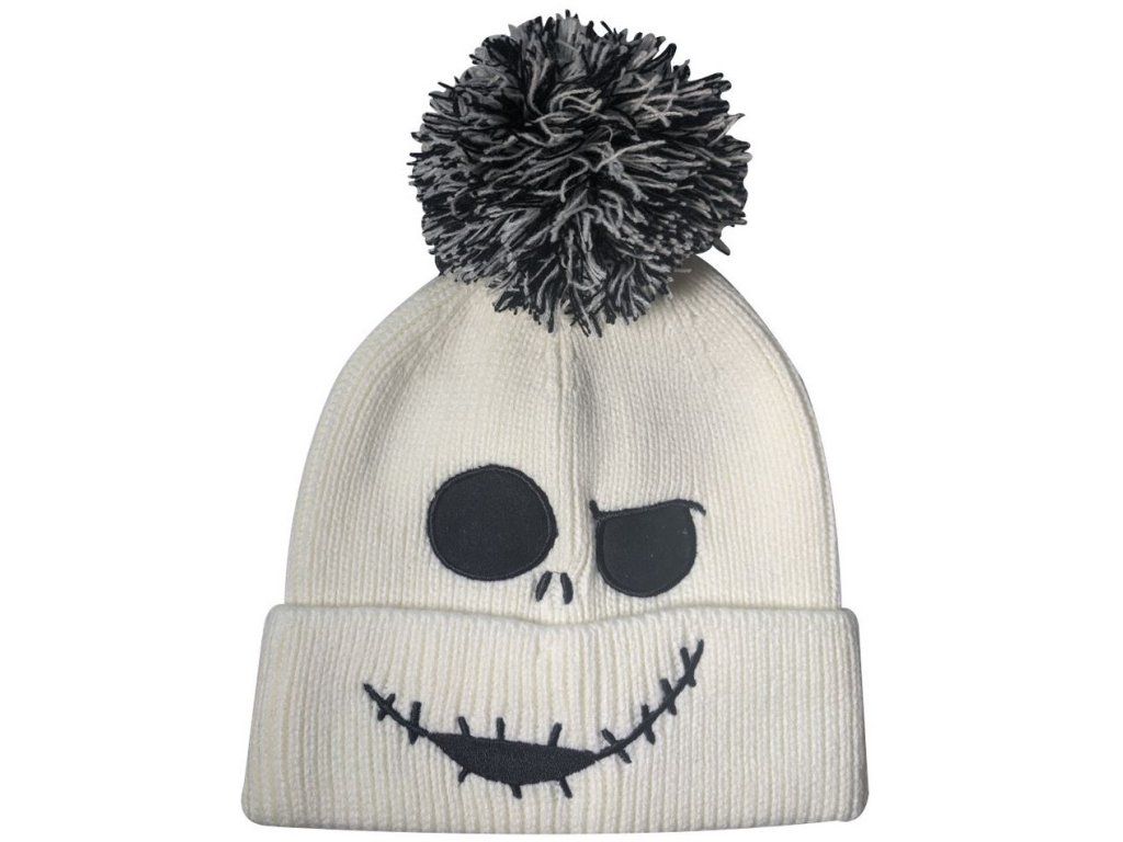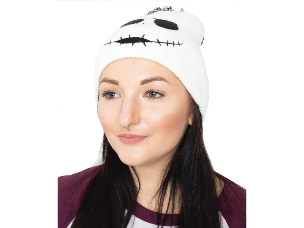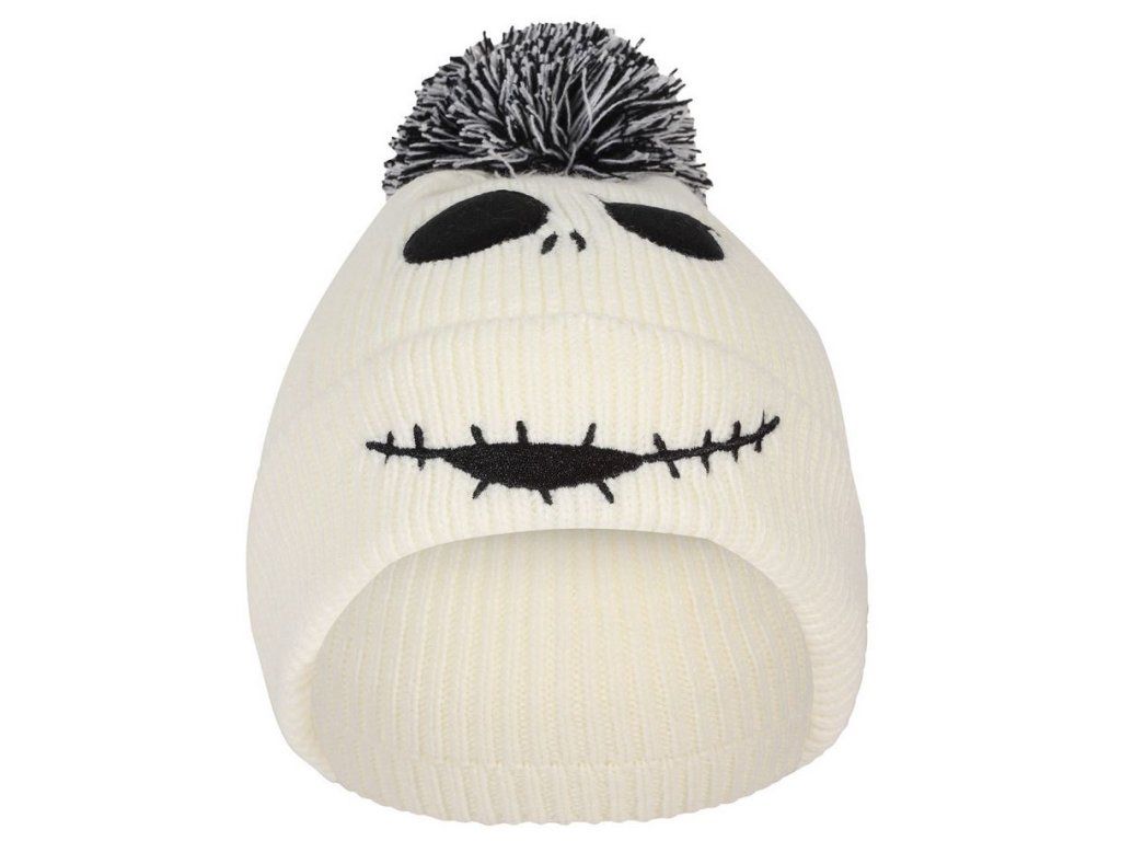 Bílá přeložená zimní čepice s bambulí a motivem postavy Jack z filmu Ukradené Vánoce.
