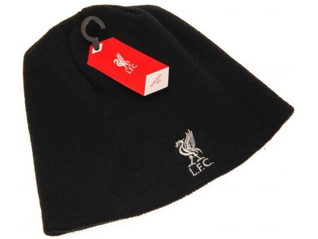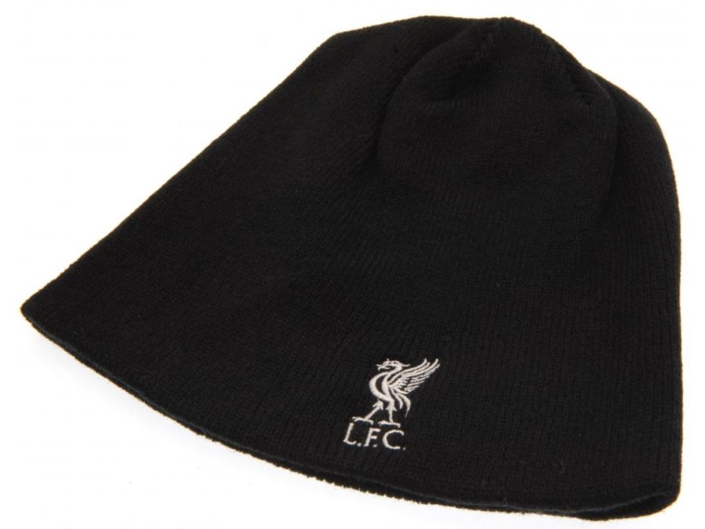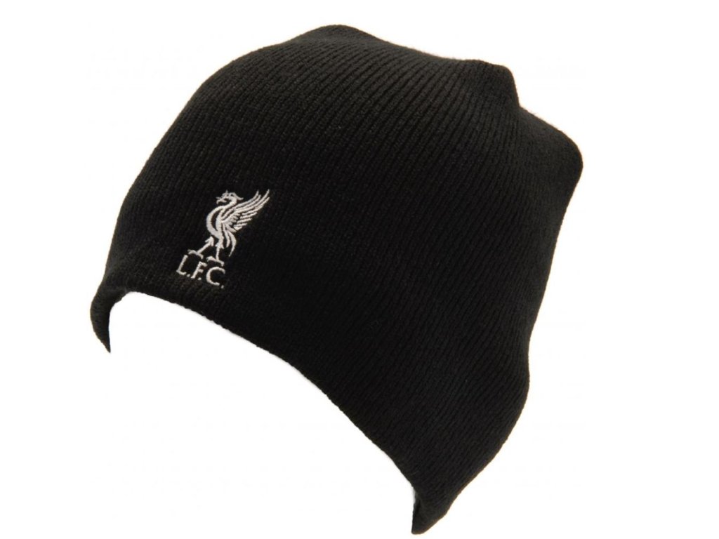 Černá zimní čepice s vyšitým znakem fotbalového anglického klubu Liverpool FC na přední straně.
