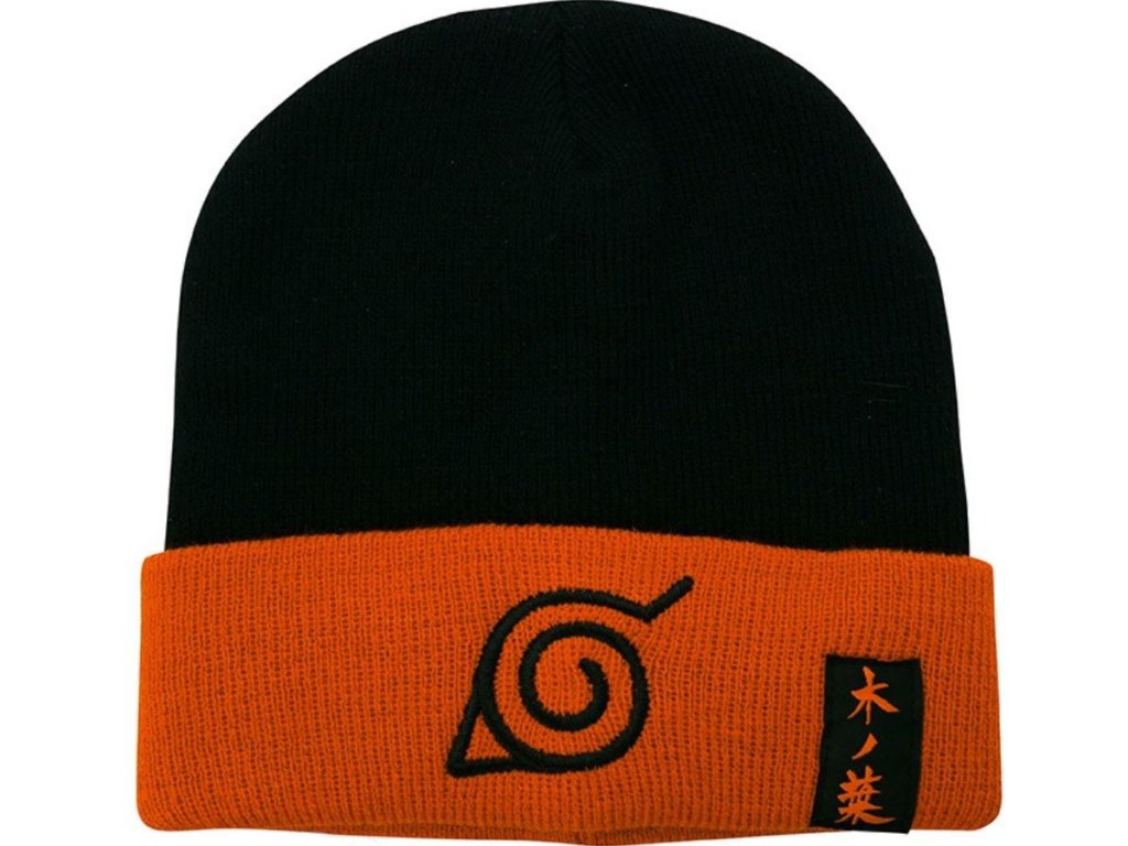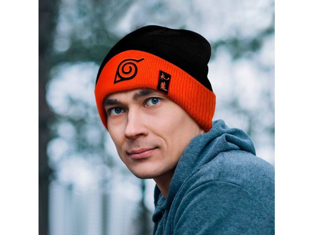 Pletená čepice s ikonickým znakem Skryté listové vesnice z anime Naruto. Kombinace černé a oranžové barvy připomíná oblíbeného hrdinu Naruta Uzumakiho a díky měkkému materiálu tě udrží v teple i během zimních misí.