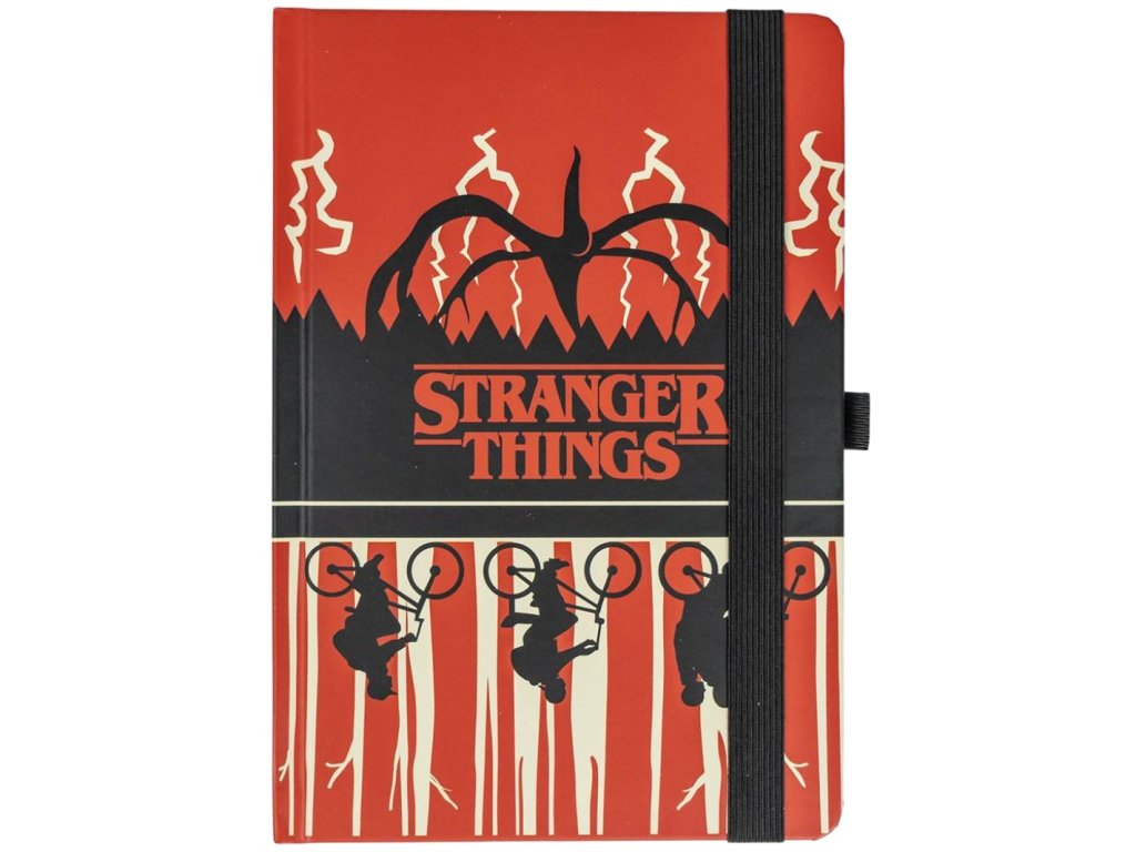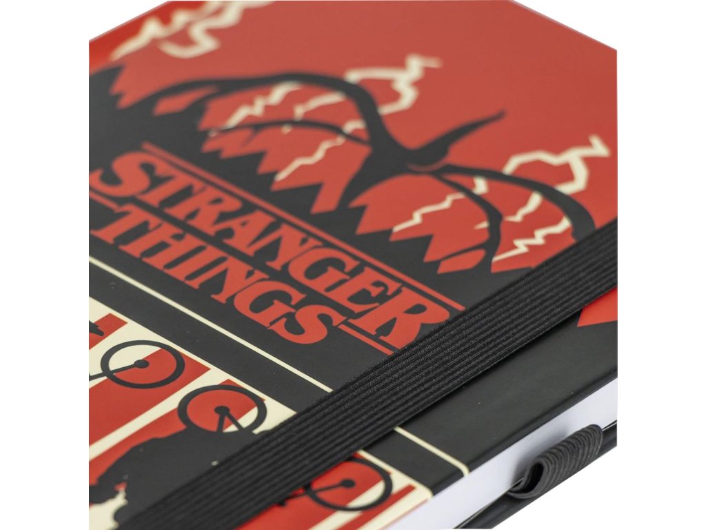 Dárkový set s poznámkovým blokem A5 a propiskou inspirovanou Demogorgonem ze seriálu Stranger Things.