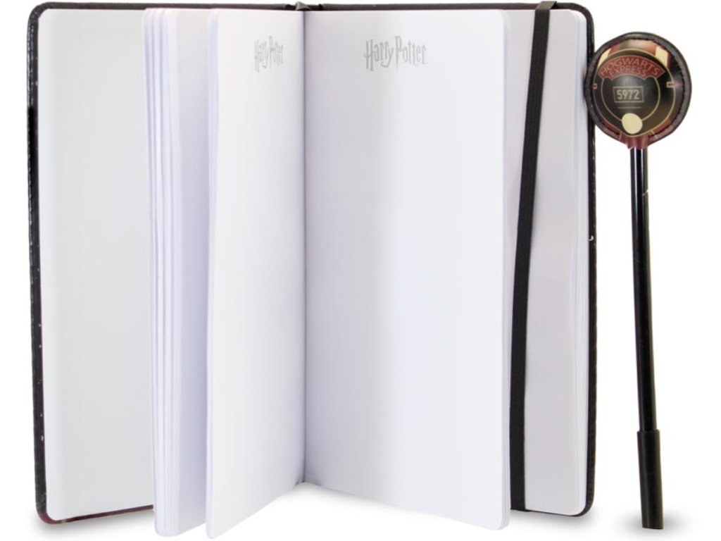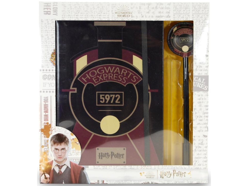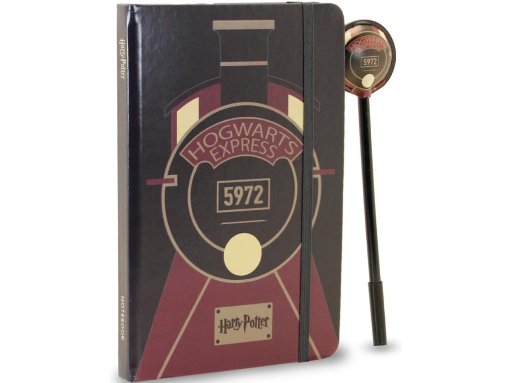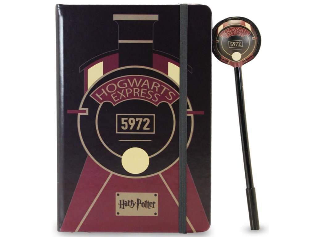 Dárkový set se 100 listovým poznámkovým blokem A5 a propiskou inspirovaný motivem Bradavického expressu z filmu Harry Potter.