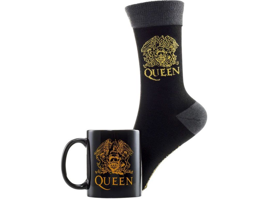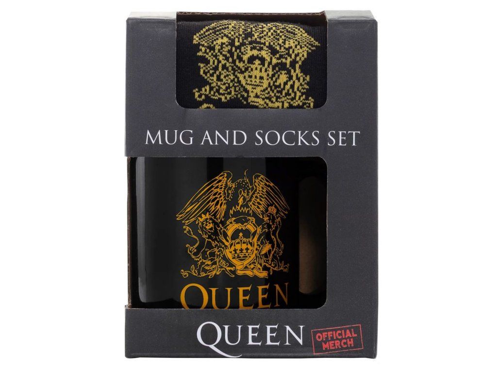 Dárkový set předmětů - hrnek s ponožkami, inspirovaný logem hudební kapely Queen. Set hrníčku a ponožek je dodávaný v dárkové krabičce se stejným motivem, a proto je celá sada vhodná jako dárek pro každého menšího i většího fanouška hudební kapely Queen.