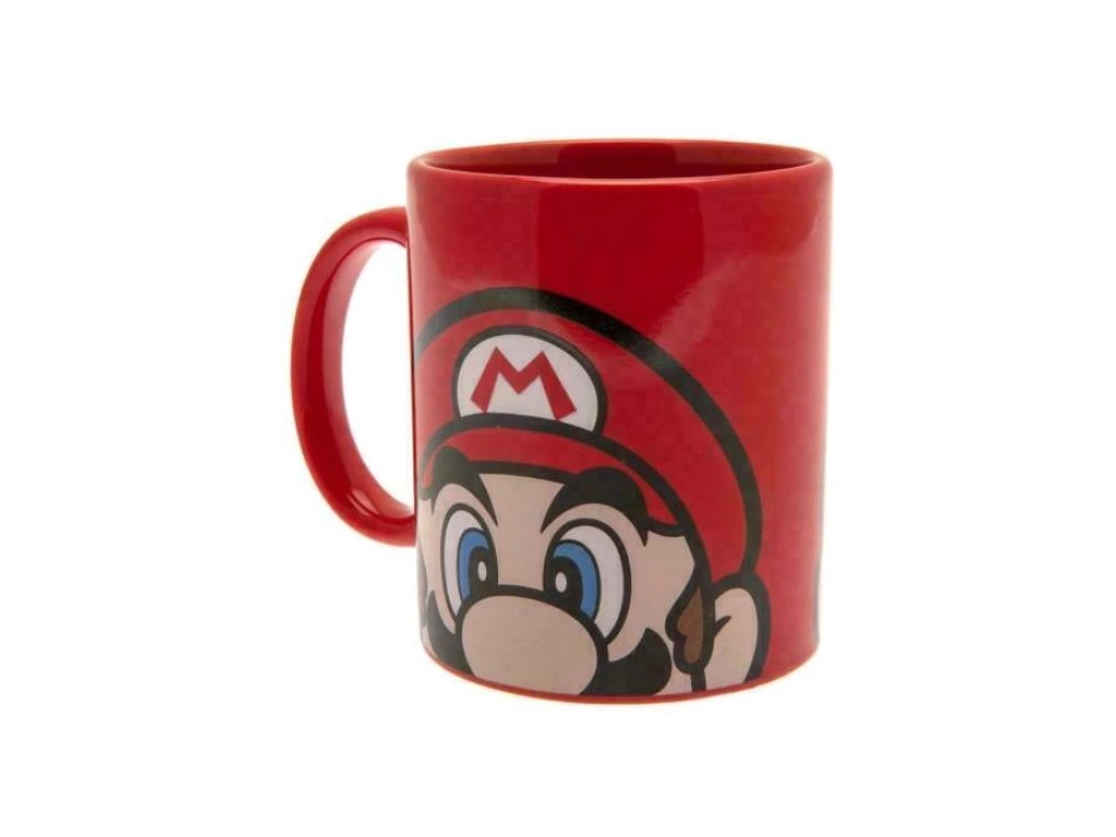 Dárkový set s logem a grafikou Super Mario . Balení obsahuje keramický hrnek, přívěsek na klíče a tácek.