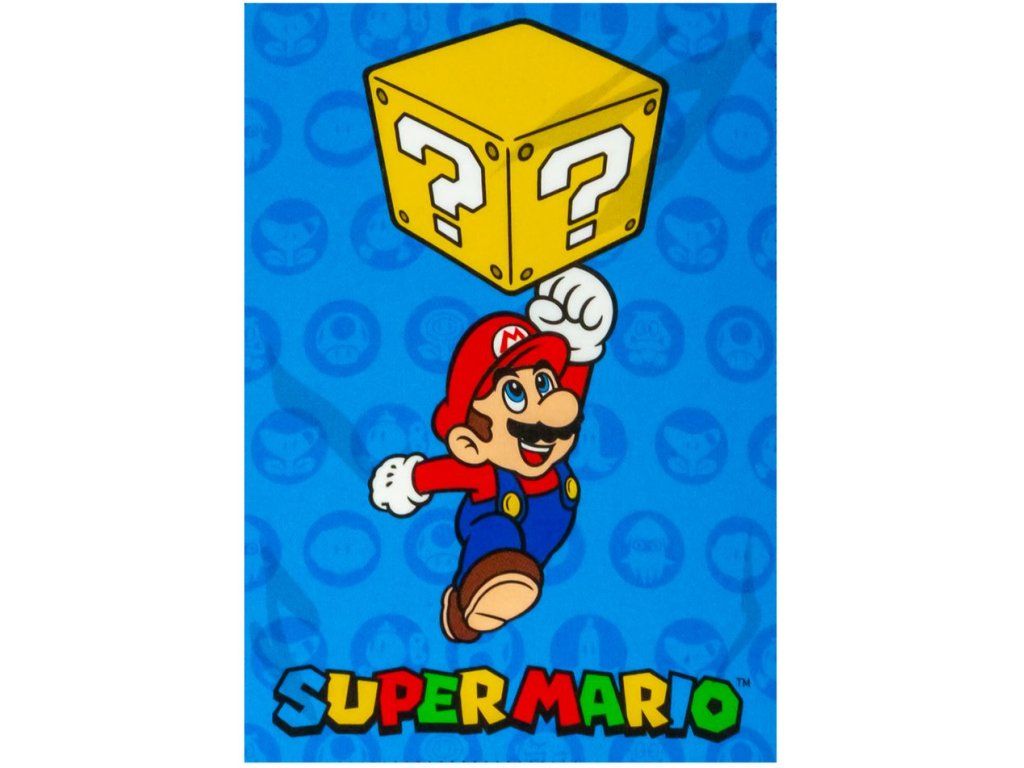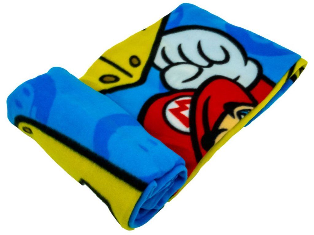 Obdelníková fleecová deka modré barvy vyvedená s postavičkou Super Maria, dosahujícího otazníkové kostky. Deka je vhodným dárkem pro všechny menší i větší fanoušky, kteří se chtějí zachumlat do něčeho pohodlného, při hraní své oblíbené videohry Super Mario.